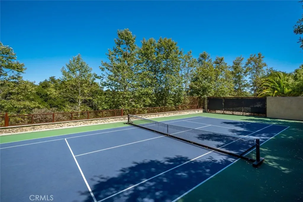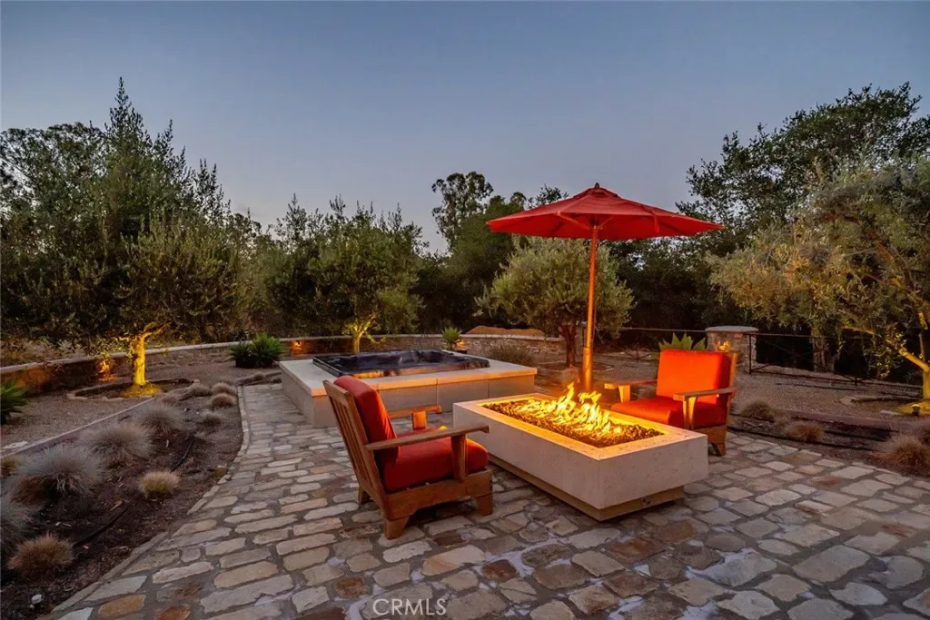 From the front lawn a pathway leads to a professional-grade multi-sport tennis and pickleball court complete with night lighting, viewing areas, a swing-out basketball hoop, and bar seating—an ideal setup for both serious play and social gatherings. In the backyard, a built-in hot tub and cozy firepit offer the perfect setting for relaxing evenings under the stars.