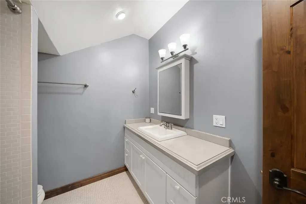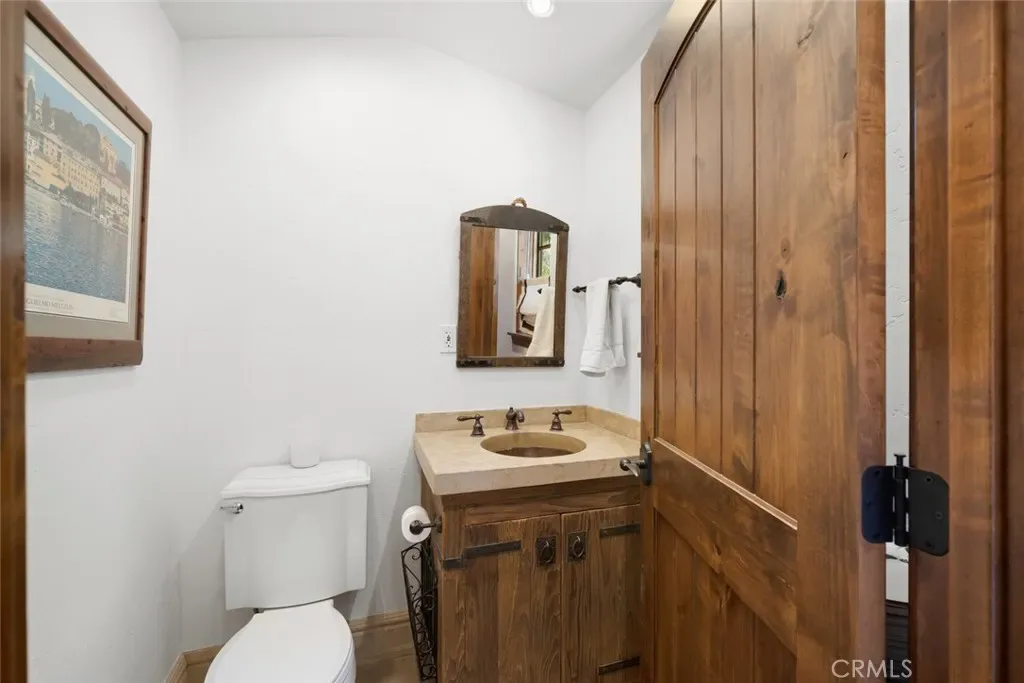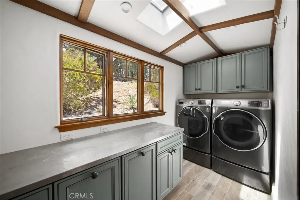 The main-level primary suite offers a peaceful escape with a spacious walk-in closet and spa-like bath featuring dual sinks, a walk-in shower, soaking tub, and large sliding doors that open to the front yard and hillside views. A cozy bonus room with fireplace opens to the backyard, while barn doors reveal a spacious laundry center with storage and folding counter.