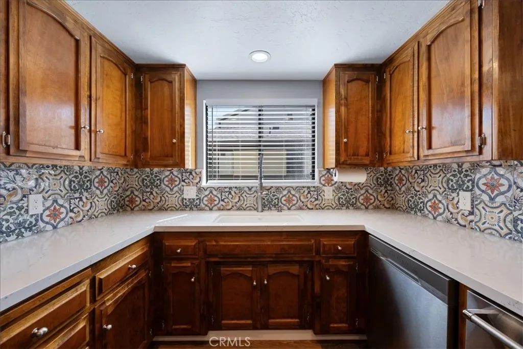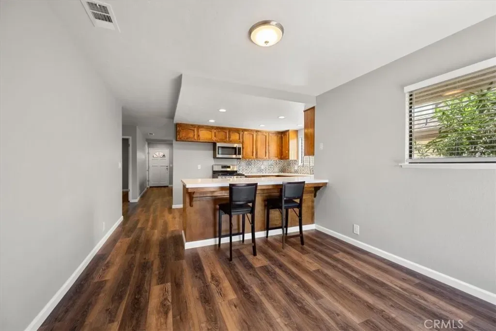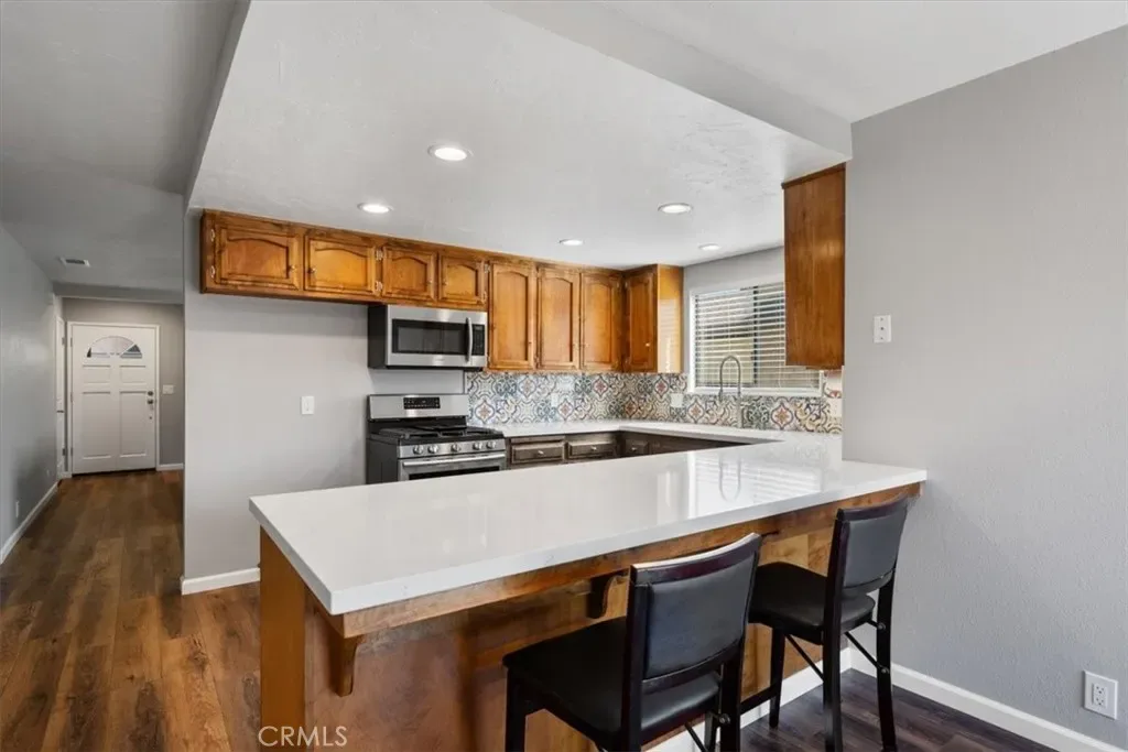 Culinary enthusiasts will love the updated kitchen, featuring gorgeous quartz countertops, a stylish tile backsplash, and sleek stainless steel appliances. The oversized breakfast bar offers transition seating into the dedicated dining area, where sliding doors lead to a low-maintenance concrete patio.