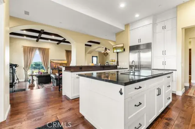 The gourmet kitchen is a centerpiece, featuring abundant custom cabinetry, extensive granite counters, high-end appliances by SubZero, Wolf, and Miele, plus a spacious pantry designed for the modern chef. The kitchen and living spaces flow to a vast outdoor space with covered patio, perfectly oriented for lounging or entertaining against a backdrop of breathtaking vistas.
