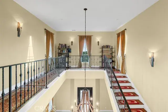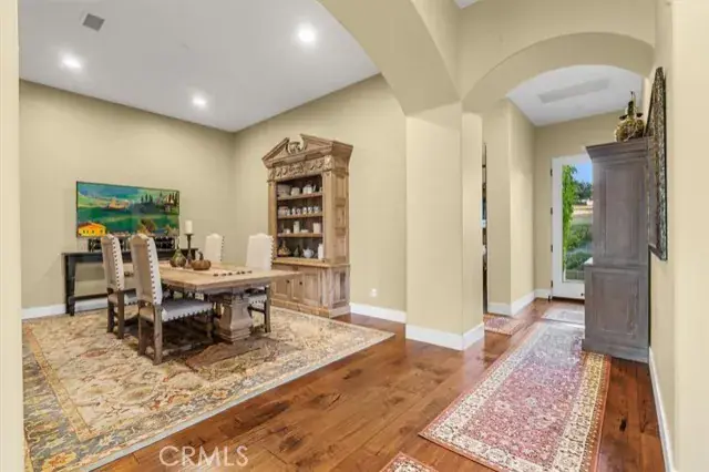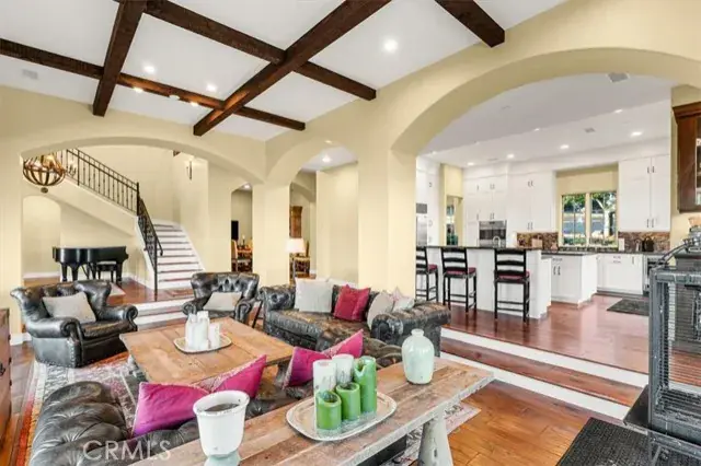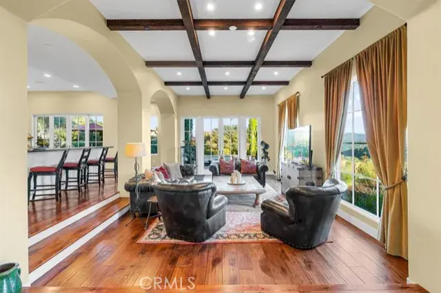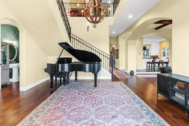Step inside the impressive foyer, where soaring two-story ceilings set the tone for the light-filled, open floor plan. Expansive windows and cathedral ceilings invite natural light throughout, highlighting timeless architectural details like arched passageways, wrought iron accents, exposed wood beams, and rich wood floors.