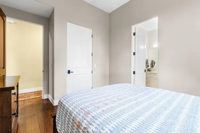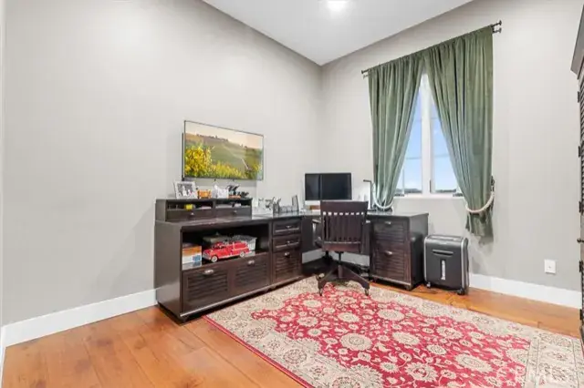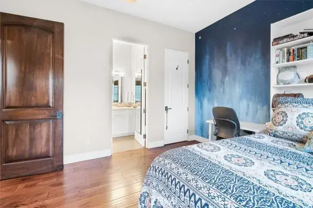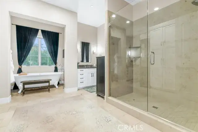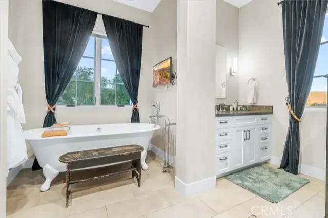 Four spacious bedrooms, each with its own en-suite bath, provide comfort and privacy, while a dedicated office offers flexibility for work or study. The primary suite is a true retreat, complete with a spa-inspired bath featuring dual vanities, a large walk-in shower, and a clawfoot soaking tub with views of open space.