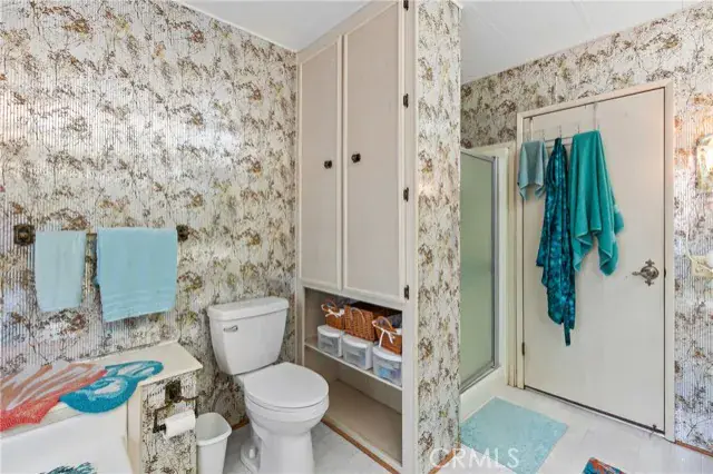 Inside, you’ll find a traditional layout with both a formal living room and dining room, plus a kitchen that opens nicely to the family room. The kitchen retains its original charm, complete with a wrap-around counter, a window over the sink, and a cozy connection to the main living space. The interior laundry room offers added storage, cupboards, and built-in desk space, leading directly to the hall bathroom. The guest bathroom is a nostalgic nod to the 70s—with wallpaper and fluorescent lighting in excellent condition for anyone who loves that vintage look.