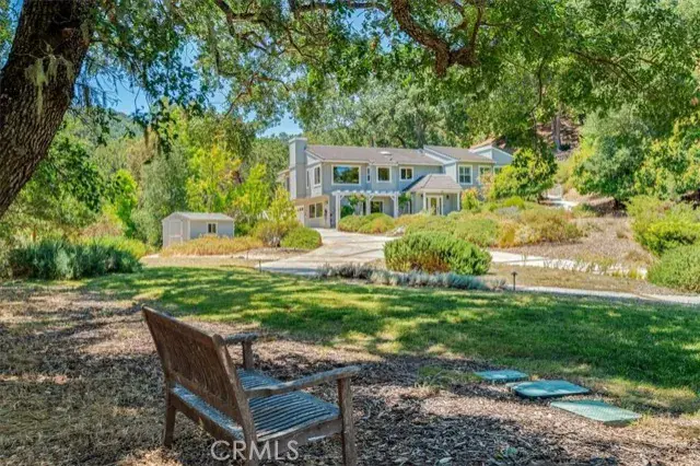 Settled in Paradise Valley in Westside Atascadero on over 7 acres, is this lovely home in a gracious park-like setting. Please ask your agent about the Natural Hazard Disclosure report for accurate info regarding fire zone and no special flood zone, online sites may not be correct. Highlighting the property is a custom landscape design, that accentuates the best of California and local native beauty. With a circular drive and gated entrance, there is ample room for guests and extra vehicles. Even a seasonal creek that flows melodiously with rain, at the base of the stately rise where the home is located. An elegant ample flagstone walkway follows the lot topography and makes the upstairs accessible from the driveway with no stairs. The high ceilings and generous floorplan include picture perfect views from nearly every window. In addition to bedrooms on the main level, there are several additional rooms on the lower level, including a spacious bonus room with built-in cabinetry. Serving the property is a solar system of 6.5 kW, fully owned and transfers with sale. The property is served by city municipal water, not a well. The deck design was inspired by a natural waterfall flow and easily transitions living space to the outdoors. Fenced area for farm animals includes a run-in paddock and shed. Don’t miss the food forest with fruit trees, fencing, and a delightful charming decorative gate!