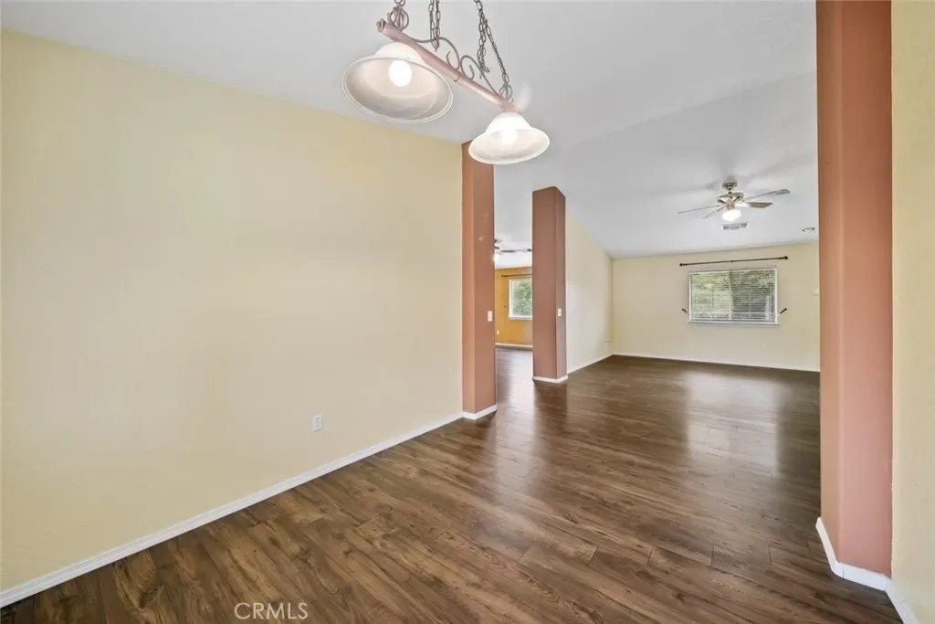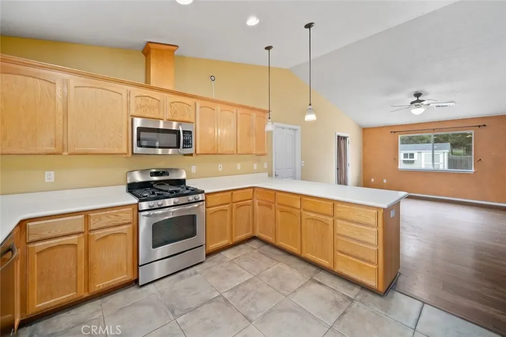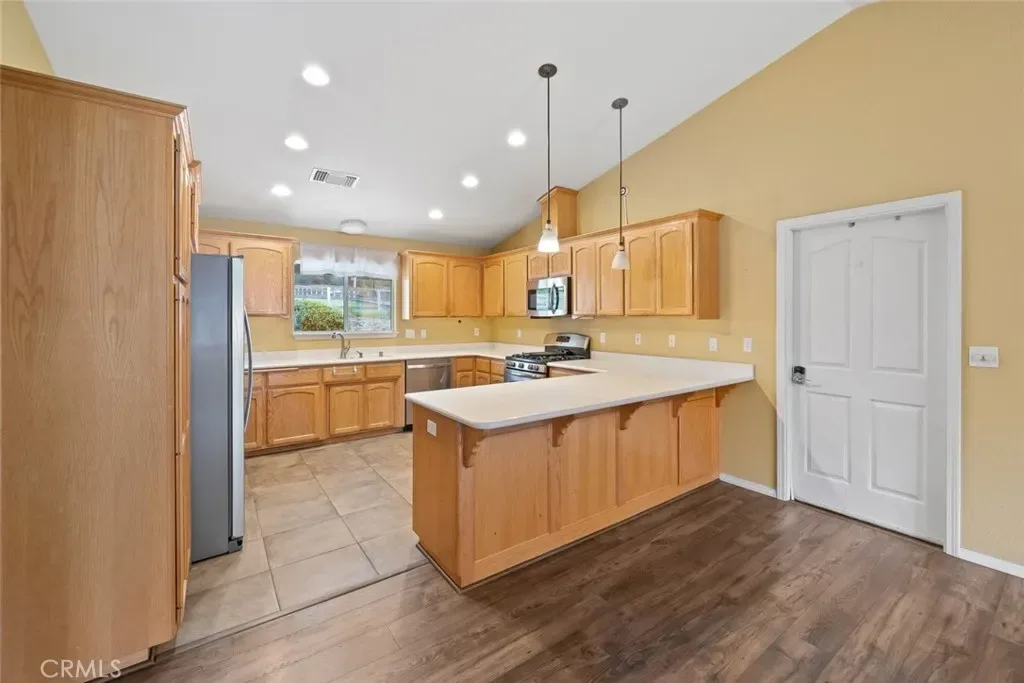 The kitchen features abundant counter space, bar seating, stainless steel appliances, and a dual basin sink, all opening seamlessly to the dining area—perfect for everyday living and entertaining. From the dining room, access the expansive backyard and the attached two-car garage with convenient laundry hookups.