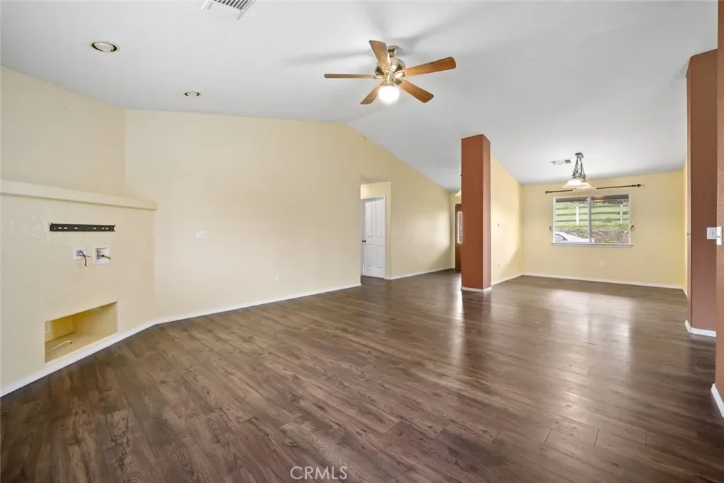 Set back from the street for added privacy, this single-level home showcases classic farmhouse appeal with timeless dormers, gabled windows, and a welcoming covered front porch. Inside, you’re greeted by soaring ceilings and abundant natural light that creates a warm and airy atmosphere. Recessed lighting, ceiling fans, and durable hard-surface flooring throughout the main living areas add both style and functionality. Thoughtful touches like electrical outlets at the living room focal point and nook for wall-mounted TVs enhance flexibility for modern living.