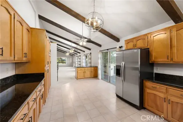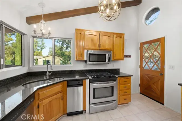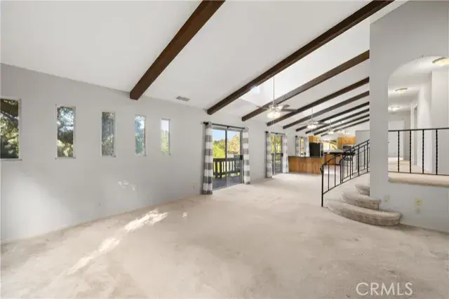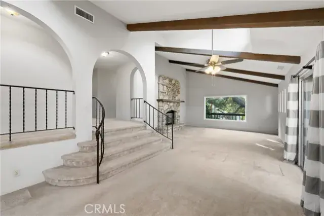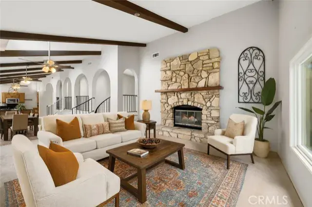 Inside, graceful arches frame the entry and great room, where soaring beamed ceilings, wrought-iron accents, and a striking stone fireplace create a warm and dramatic focal point. A large picture window overlooks the lush, oak-studded backyard, while three dormer windows and multiple sliders fill the space with natural light and invite seamless indoor-outdoor living.