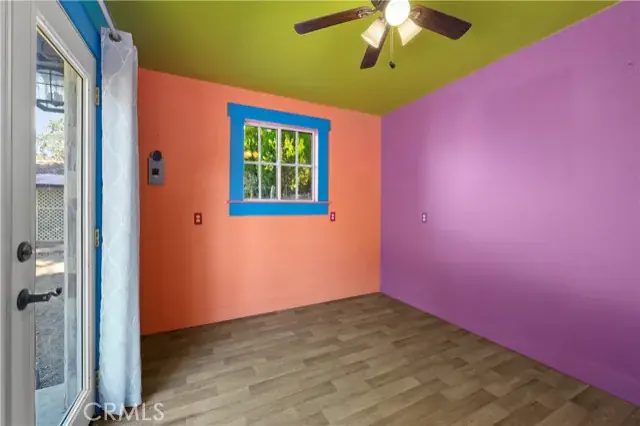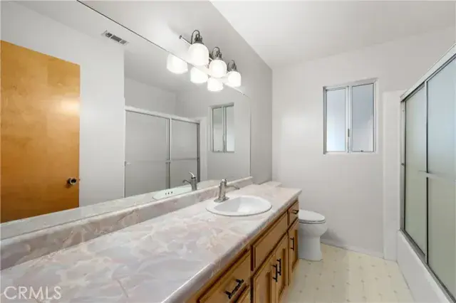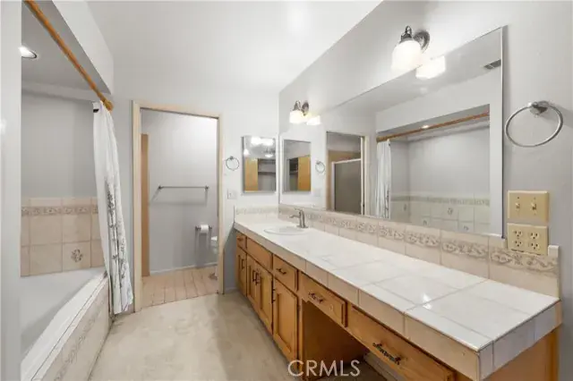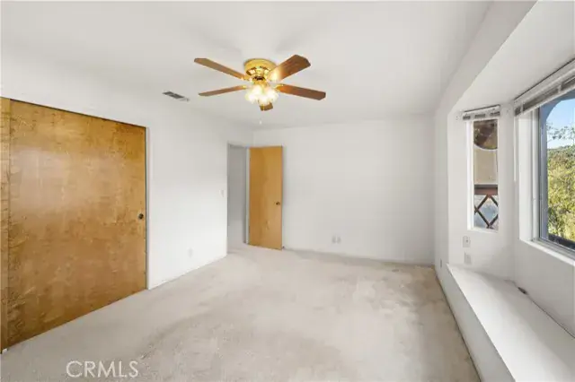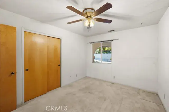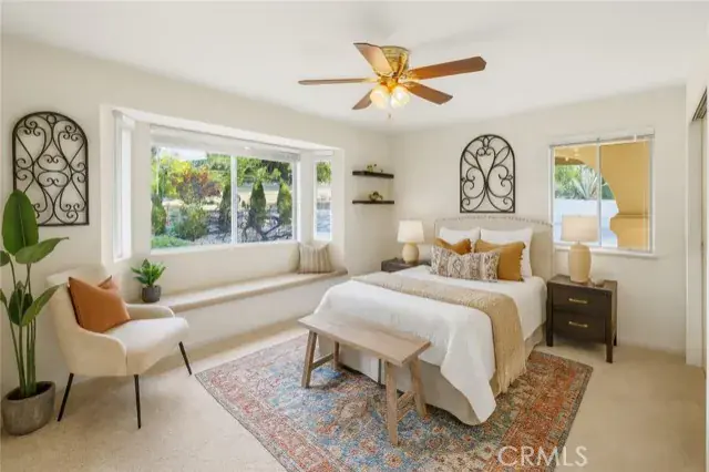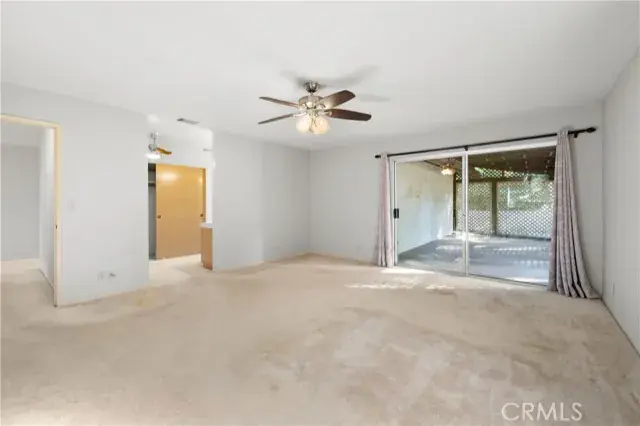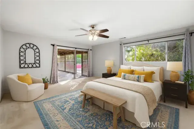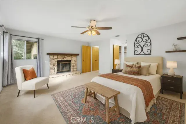 The primary suite includes its own stone fireplace and sliding doors that open to a private patio and the backyard. Two additional bedrooms and a full guest bath complete the home’s comfortable layout.