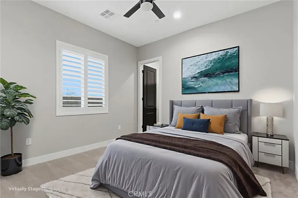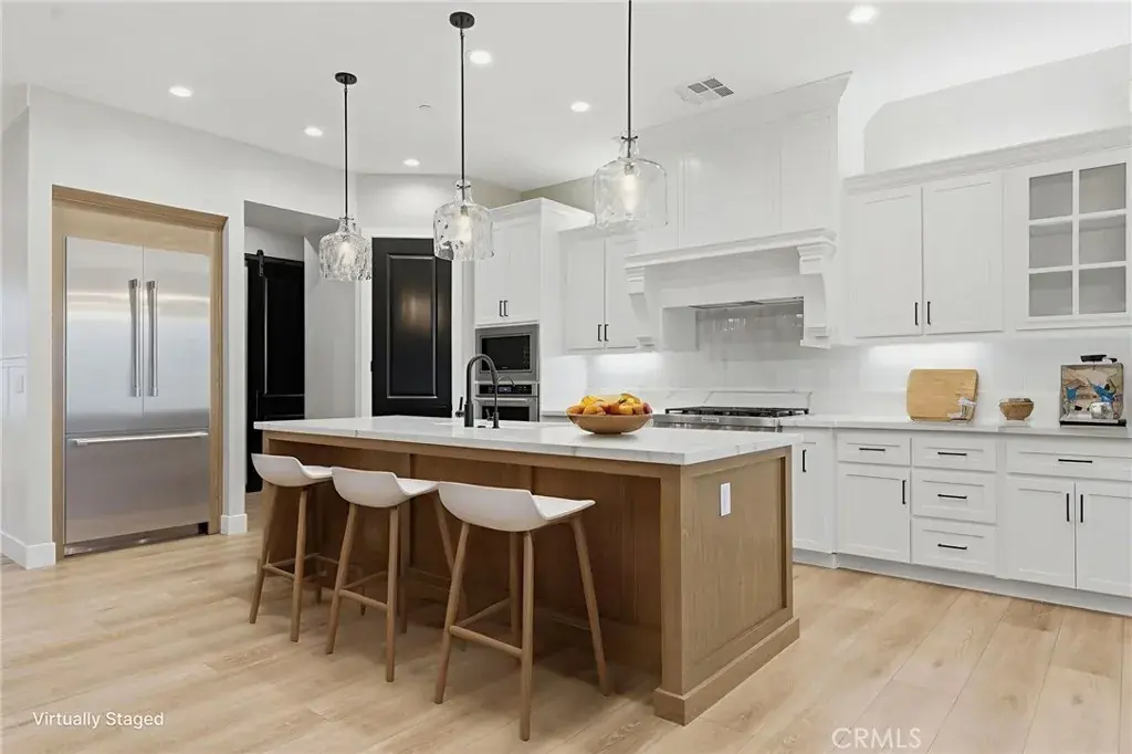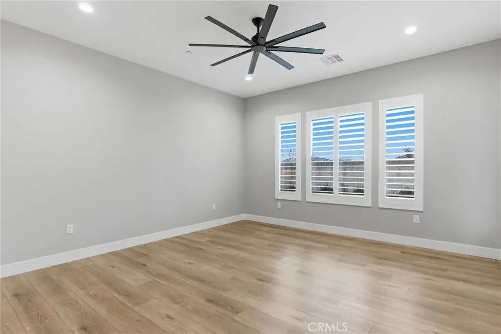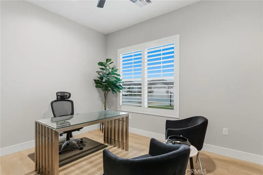Step into classic modern luxury in the Manorwood Square community by Brian Rice Construction. This former model home offers 4 bedrooms, 2.5 baths, and a spacious game room with an open-concept layout ideal for living and entertaining. The home features a gourmet kitchen with KitchenAid appliances, a custom 36-inch Thermador built-in refrigerator, quartz countertops, and soft-close custom cabinetry. Luxury plank flooring, wood shutters throughout, and a spa-style walk-in shower elevate the design. The great room includes a sleek, flush-mounted 85-inch TV. Situated on a 13,068 sq ft lot, the property offers over 40 feet of concrete pad behind the RV gate, perfect for RV or trailer parking. Owned solar panels add efficiency and long-term value.