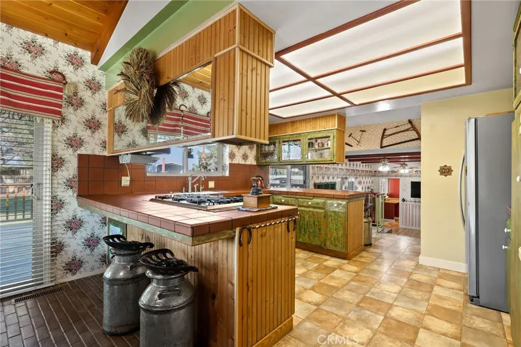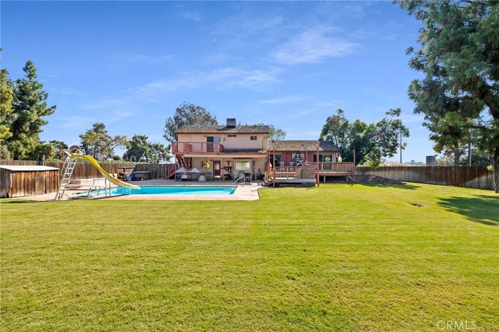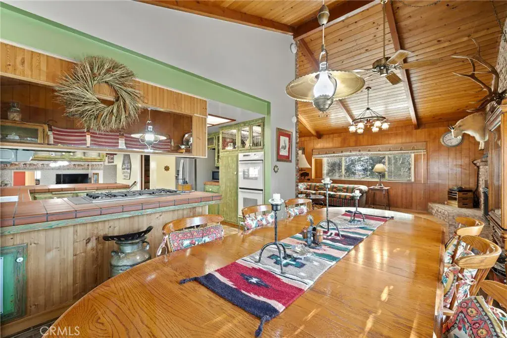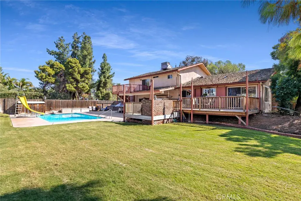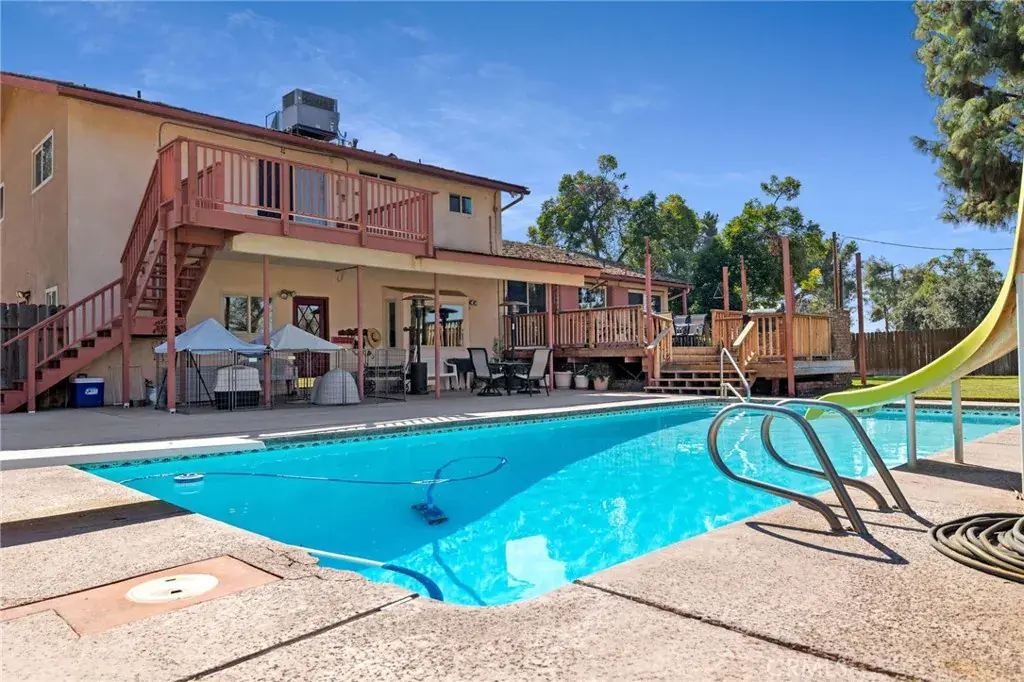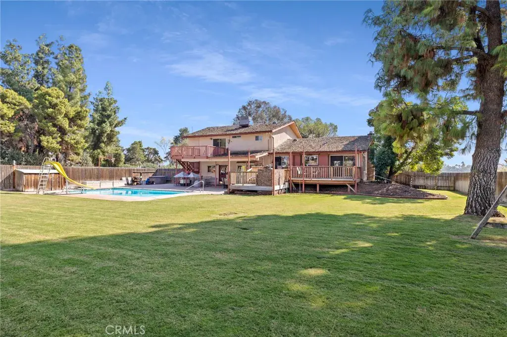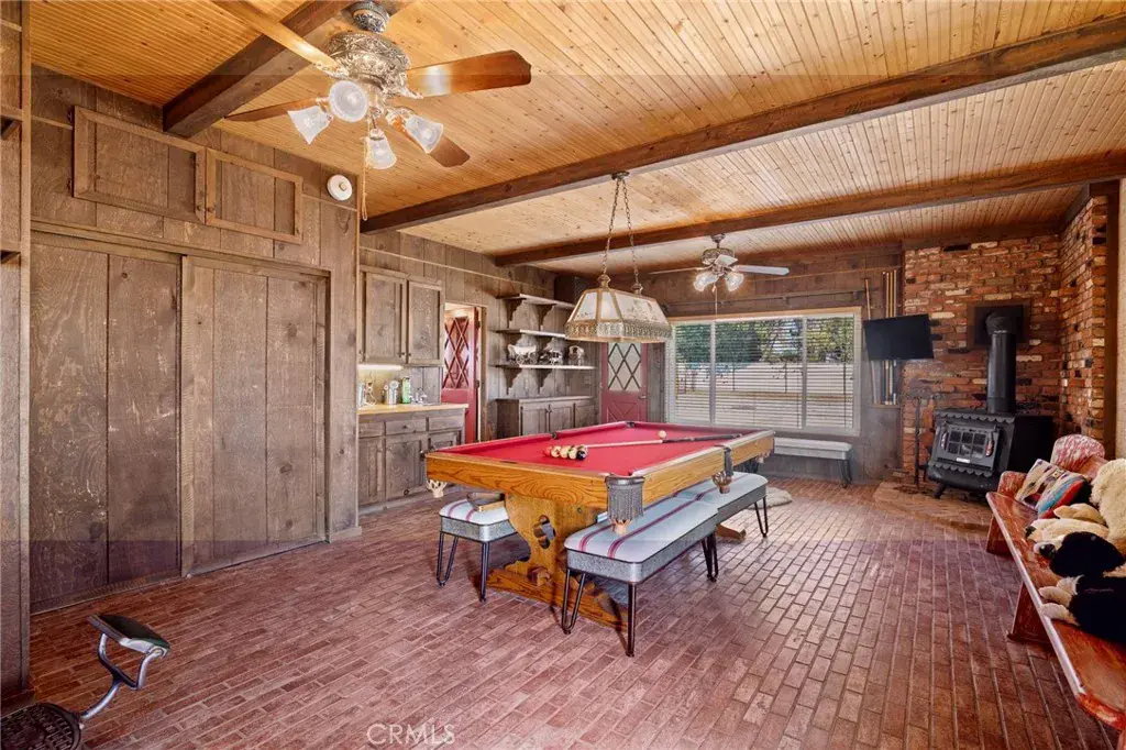 Experience the perfect blend of country living and modern comfort on 4 acres zoned RS. This 4 bedroom, 3 bath, 2,443 sq. ft. home showcases natural warmth with wood-look flooring, vaulted wood-beamed ceilings, and striking brick accents that create a lodge-style ambiance. In addition to a welcoming living room and cozy family room, enjoy a spacious game room with a wet bar—perfect for entertaining. The kitchen features a newer Dacor cooktop and bar top seating, while two large decks-the bottom deck redone in 2023 and the top deck redone in 2025, extend your living outdoors. Relax by the pool, host gatherings in the outdoor kitchen, or take advantage of equestrian amenities including horse pens, roping arena, tack room, and a drip system for fruit trees. Designed for lifestyle and function, this unique retreat offers room to roam, spaces to entertain, and timeless character throughout.