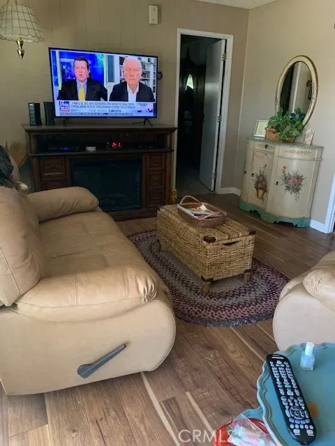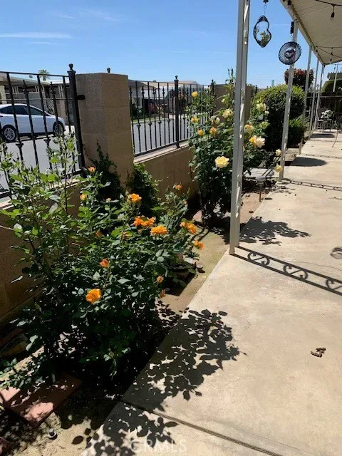 RARE corner lot with garage door! This home has it all. Perfectly situated on a premier corner lot right next to the mail boxes and across the street from the golf course. Not many mobile homes can say they have an enclosed driveway (garage) with separate double shed for maximum storage. The kitchen was completely renovated and updated in 2023 with a custom coffee bar next to the pantry. This home has a large covered porch area with lovely rose bushes, plants, and faux grass at the rear of the yard. Completely fenced in for privacy and security. Less than a year old hardwood floors in the living area. Bedrooms have carpet. Mirror closet doors in secondary bedroom. Laundry is inside the home and laundry area can also serve as an office area. Separate formal living area and dining room, with family room (den) off kitchen. Master bedroom has private bathroom with Roman tub and stand up shower, and dual sinks. Second bedroom has ensuite bathroom that also connects to laundry room and has walk-in shower.