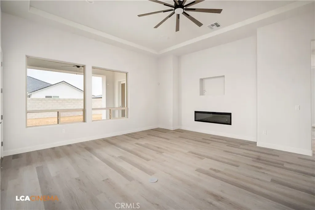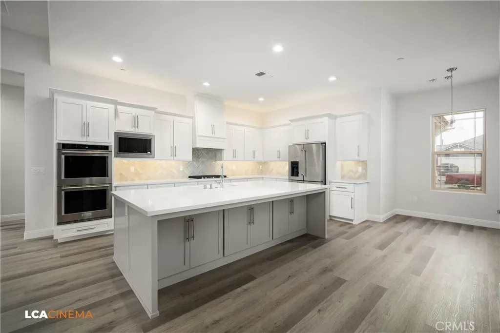 LVT throughout, custom built cabinets, quartz countertops, stainless steel appliances including refrigerator, 8’ interior door package, electric 5000 BTU fireplace, tiled showers, laundry sink, can lighting in all bedrooms, dining, and great room.