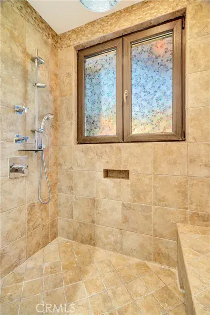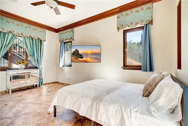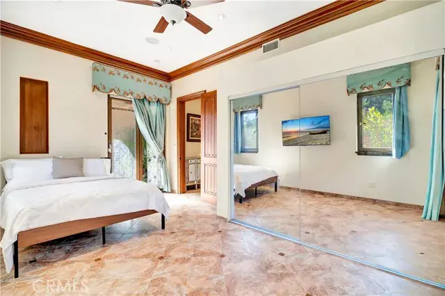 The oversized primary suite serves as a true retreat, with soaring ceilings, mirrored closet doors, and tranquil views of the park-like backyard, providing the perfect space for relaxation and privacy.