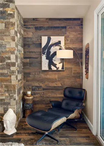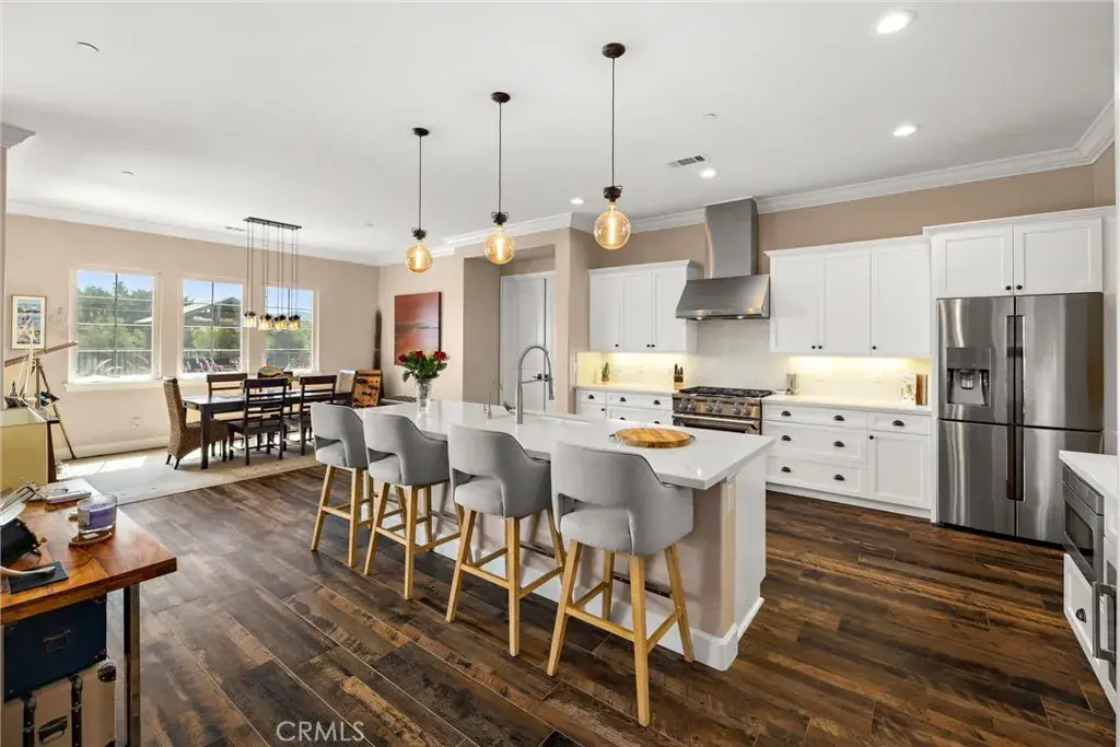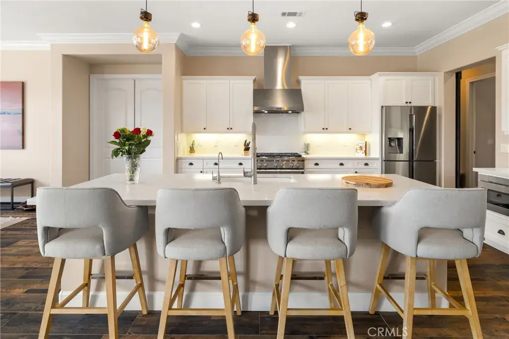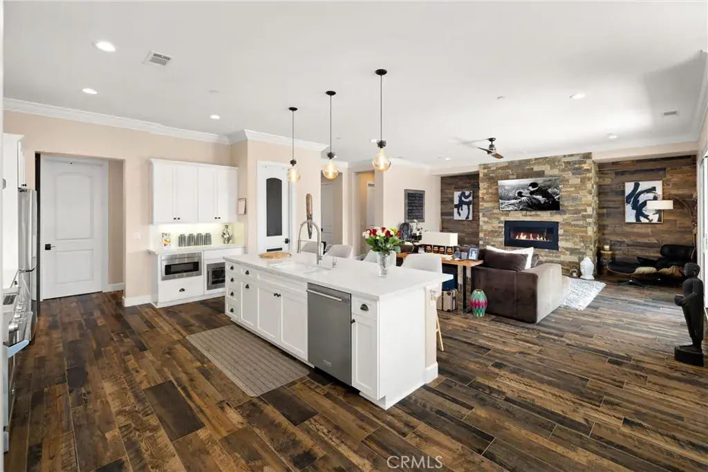 Step into a light-filled open floor plan with 10-foot ceilings and 8-foot solid-core doors, creating an immediate sense of space and sophistication. The gourmet chef’s kitchen is the heart of the home, featuring quartz countertops, custom soft-close cabinetry, premium appliances, and a wine refrigerator. The living room centers around a striking hand-cut stone fireplace, while durable wood-look tile flooring flows throughout, blending warmth with practicality.