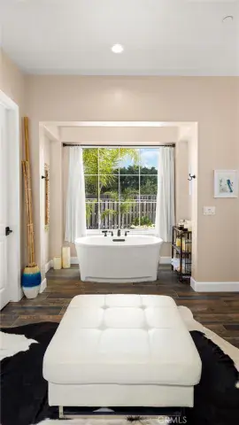 The primary retreat is a sanctuary, boasting a spa-inspired bathroom with dual vanities, a soaking tub, walk-in shower, private water closet, and expansive walk-in closet. A dressing/sitting area adds a touch of luxury, making this suite feel like a private escape.