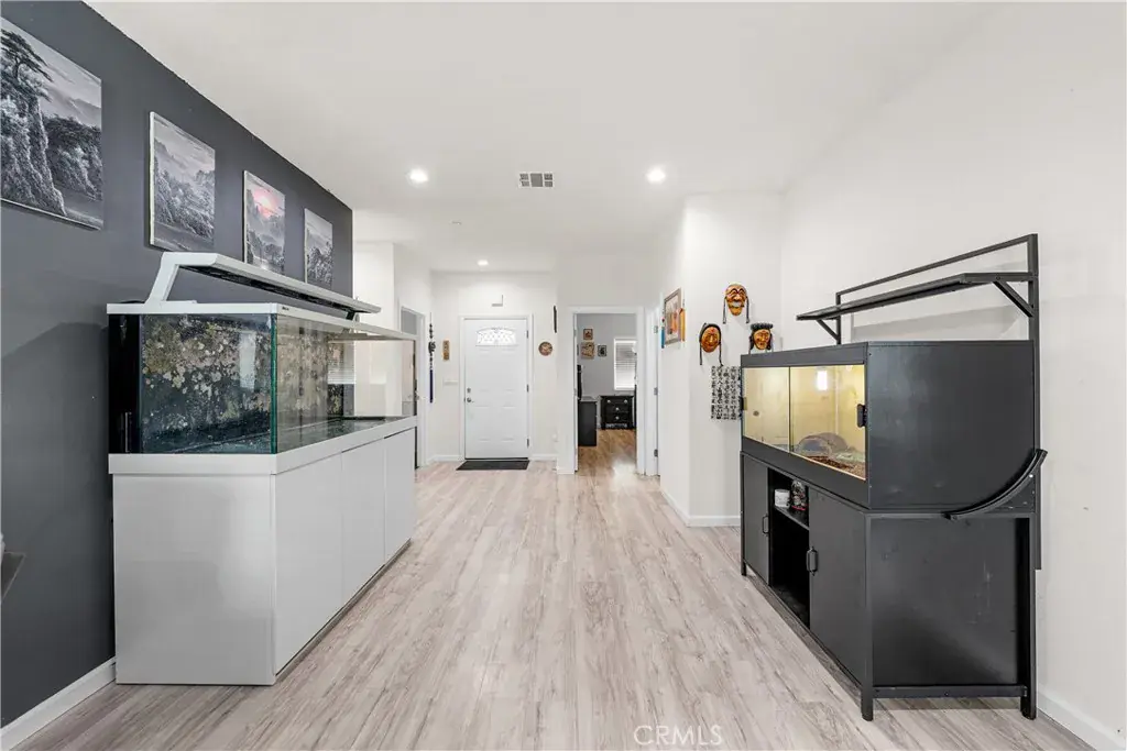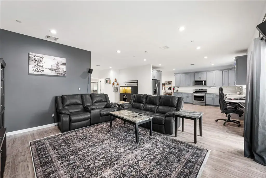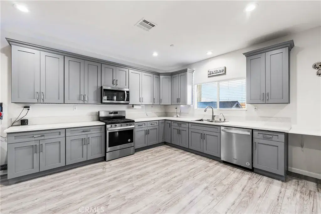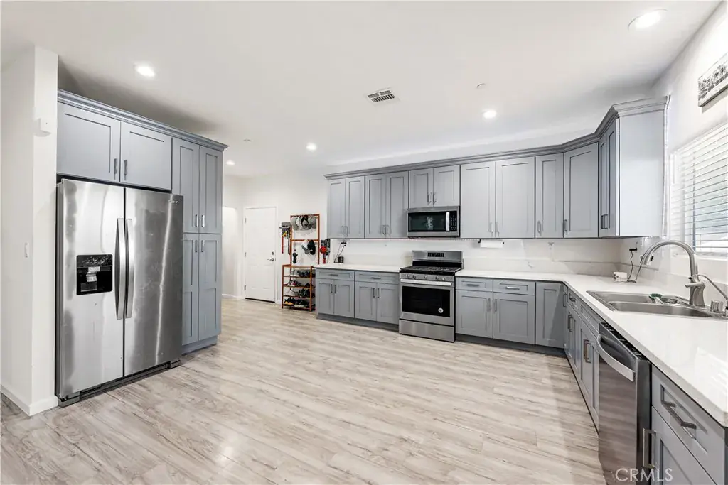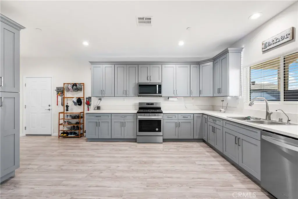 The kitchen is a dream with gorgeous quartz countertops, ample cabinet and counter space, and a dedicated pantry area ideal for small appliances or overflow storage. The gray cabinetry perfectly complements the vinyl plank flooring and modern accent walls, creating a clean and contemporary feel throughout.