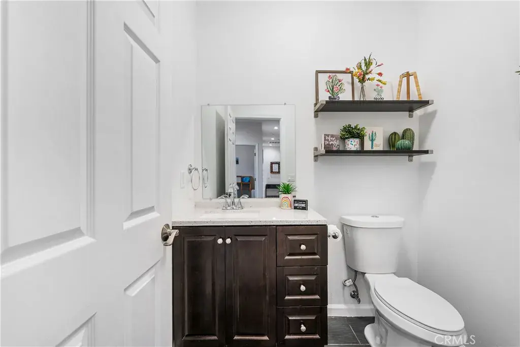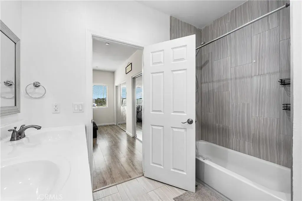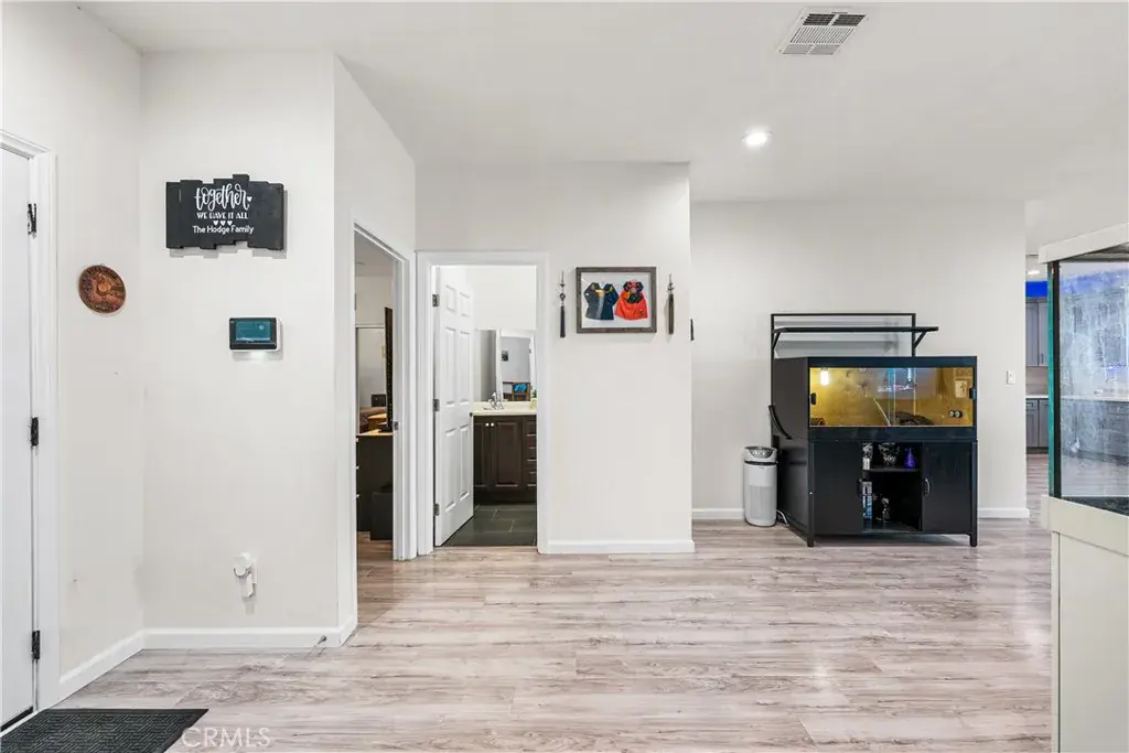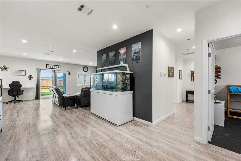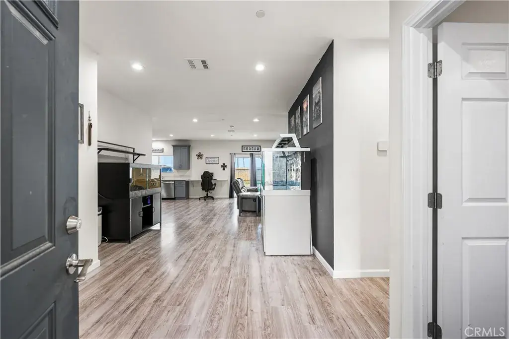The kitchen is a dream with gorgeous quartz countertops, ample cabinet and counter space, and a dedicated pantry area ideal for small appliances or overflow storage. The gray cabinetry perfectly complements the vinyl plank flooring and modern accent walls, creating a clean and contemporary feel throughout.