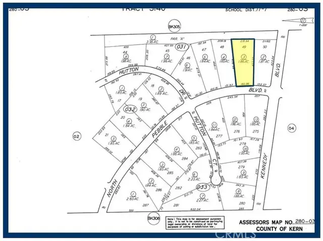 Lot 49 Map 3140, 1.86 Acres, (Apn: 280-031-03-007) GPS: 35.21602, -117.78711 on Pebble Blvd in California City, CA. California City is in northern Antelope Valley in Kern County. California City is 18 miles northwest of Edwards Air Force Base, 40 miles north of Lancaster and 28 miles east of Tehachapi. California City has zoned this property as RM1/MR2 Multiple Family Residential. According to the City the following uses are permitted: Single Family Dwellings, multiple family dwellings, riding stables, corrals and animal keeping. No utilities are currently available to this lot. Electricity is approx 1100 ft East. Please check with the City for water and sewer distance. Please use GPS Coordinates to locate property GPS: 35.21602,-117.78711