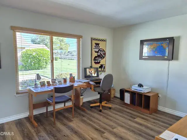 Absolutely gorgeous and highly upgraded Amalfi model located on the perimeter of Camarillo’s premier 55+ gated community–Leisure Village! This popular floorplan offers 2 spacious bedrooms plus a 3rd room ideal for an office, den, or guest room. Enjoy stunning greenbelt and mountain views from this extremely private, serene, and quiet setting. Everything in this home has been beautifully updated, including vinyl plank flooring throughout, neutral paint, and a remodeled kitchen with granite counters, stainless steel appliances, and soft-close drawers with pull-outs. Both bathrooms have been completely redone with stylish vanities, lighting, mirrors, and walk-in tiled showers with glass enclosures. Additional features include mirrored closet doors and an interior laundry room. The backyard is truly special, featuring a large, covered patio with three skylights, perfect for relaxing and taking in the peaceful views. The HOA covers water, sewer, trash, cable TV, internet, landscaping, 24-hour guard-gated security, and all community amenities, activities, and clubs. Experience the retirement lifestyle you’ve been dreaming of. Welcome Home!