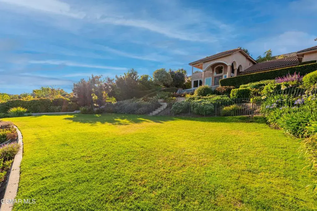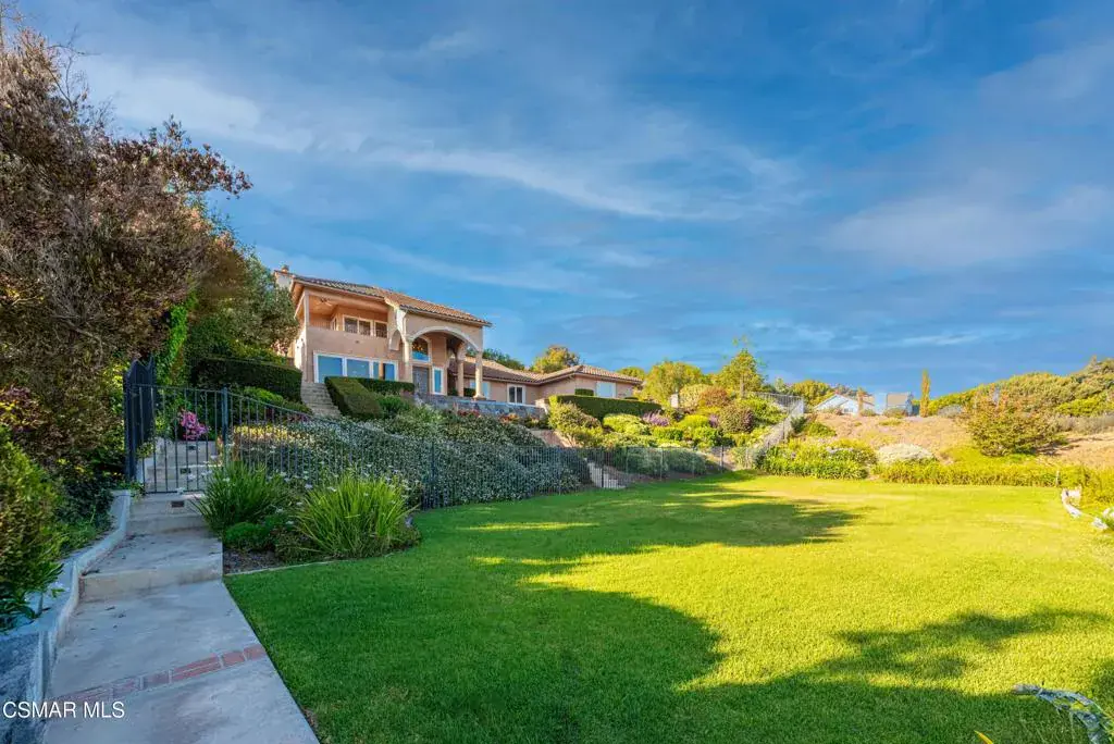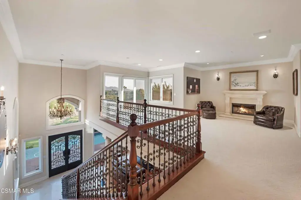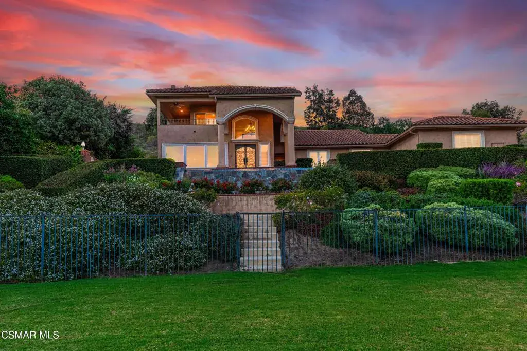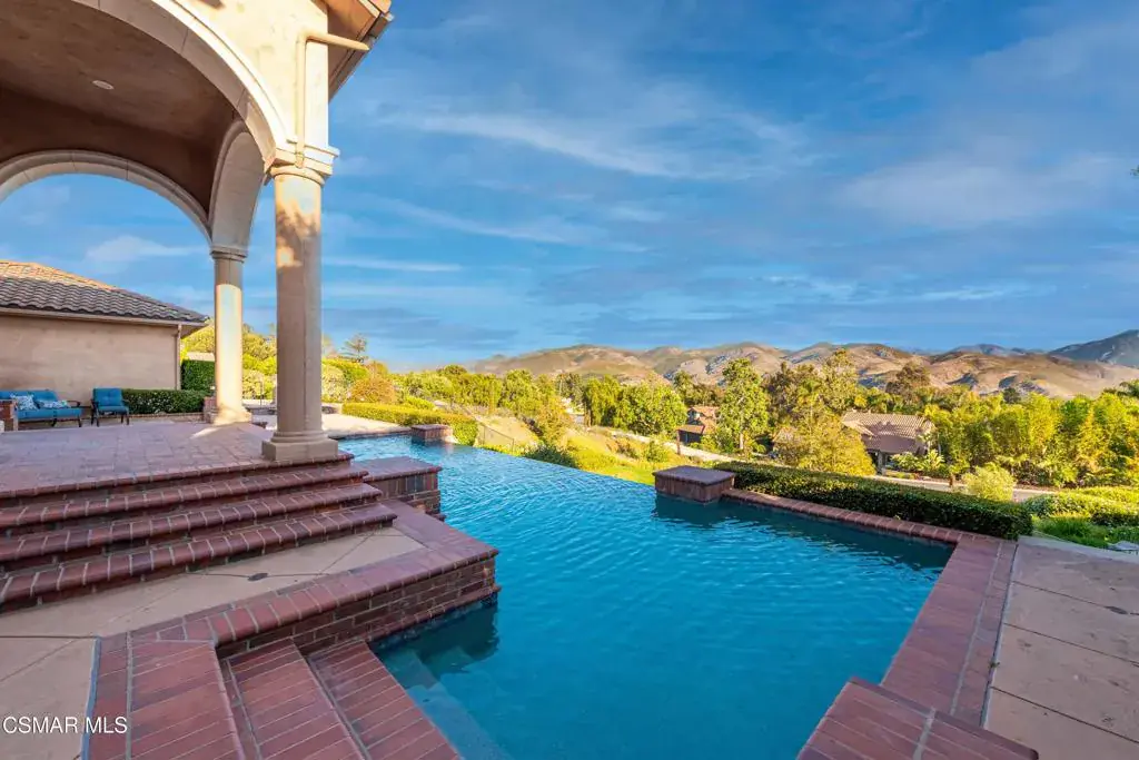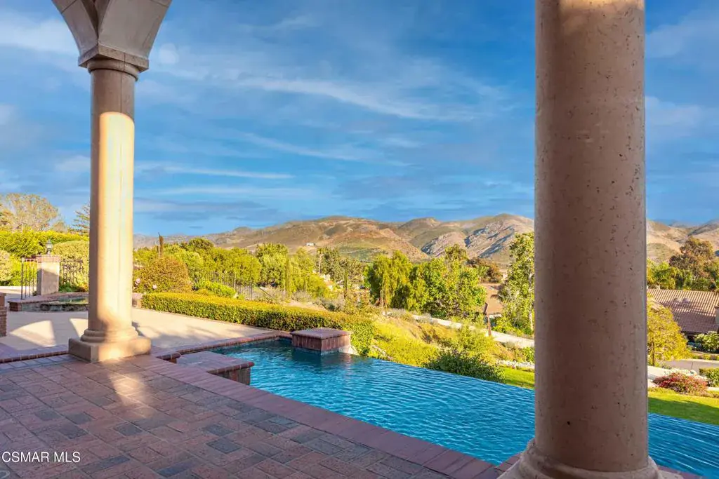 The stage is set for this magnificent custom-built estate in one of the most coveted neighborhoods of Santa Rosa Valley, a truly world-class Camarillo property showcasing breathtaking panoramic views that rank among the finest in all of Ventura County. Spanning approximately 4,600 sq. ft., this rare 6-bedroom, 6-bath luxury residence blends Tuscan warmth with refined elegance and has been meticulously updated with the highest-quality custom finishes throughout. Set on an expansive 1.31-acre lot, the home is a car enthusiast’s dream, featuring a 5-car garage (3-car attached plus an oversized 2-car detached garage/workshop with its own A/C and half bath), extensive RV and boat parking, a 50-amp EV charging port, and ample space for additional vehicles. The downstairs living space offers an open floor plan with soaring ceilings, Italian travertine tile and warm wood flooring, two primary suites with spa-like bathrooms and custom walk-in closets, spacious guest rooms with vaulted ceilings, updated baths, an oversized chef’s kitchen with granite countertops, Wolf range, GE Monogram refrigerator/freezer, beverage fridge, bar seating, a custom oak wine cellar with wrought-iron gates, and a large laundry room. Upstairs, a spacious loft/library with fireplace, a stunning balcony with sweeping views, and a third primary suite with dual walk-in closets and a luxurious bathroom further elevate the home. Modern smart-home features include a SONOS speaker system with individual room controls, Wi-Fi mesh system, whole-home entertainment integration, and a Jandy remote pool system. Outside, the private, multi-tiered grounds are an entertainer’s paradise, offering a long rebar-reinforced private driveway, expansive grassy play area, mature landscaping with fruit trees and herb garden, BBQ area, multiple outdoor lounge spaces, paid-in-full solar with 43 panels, and a show-stopping infinity pool with Idaho stone spillover and spa–an unmistakable toast to luxury living at its finest.