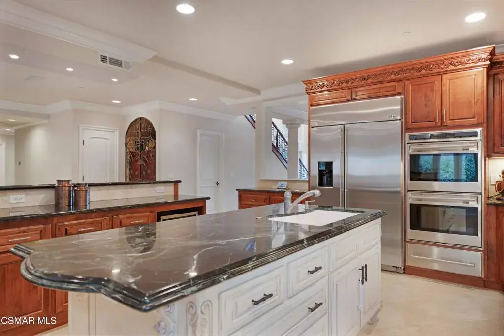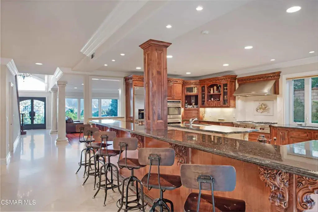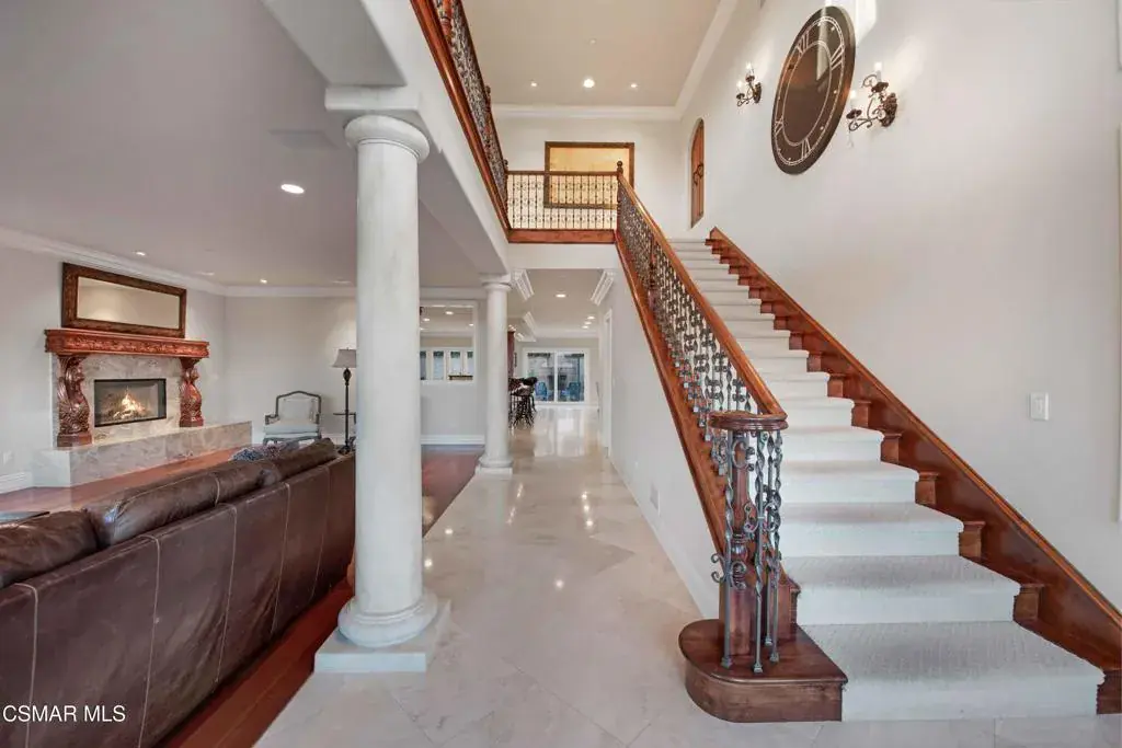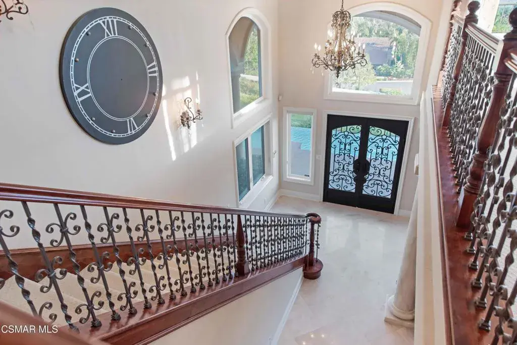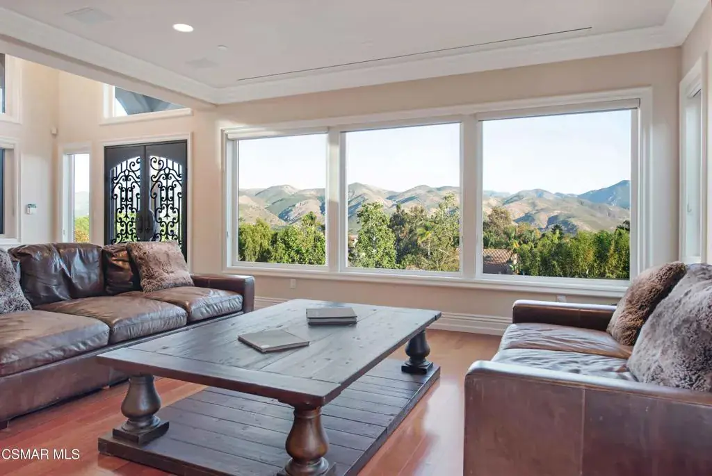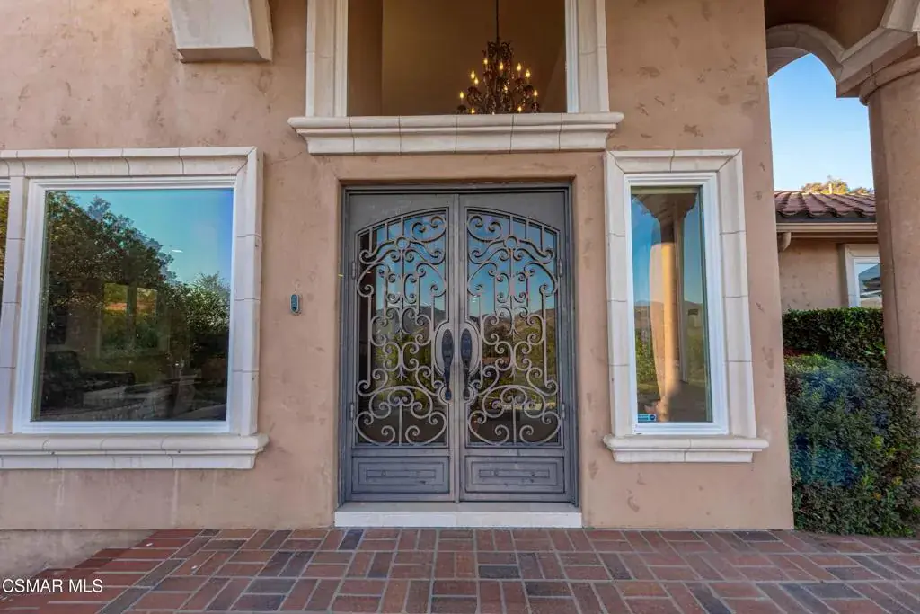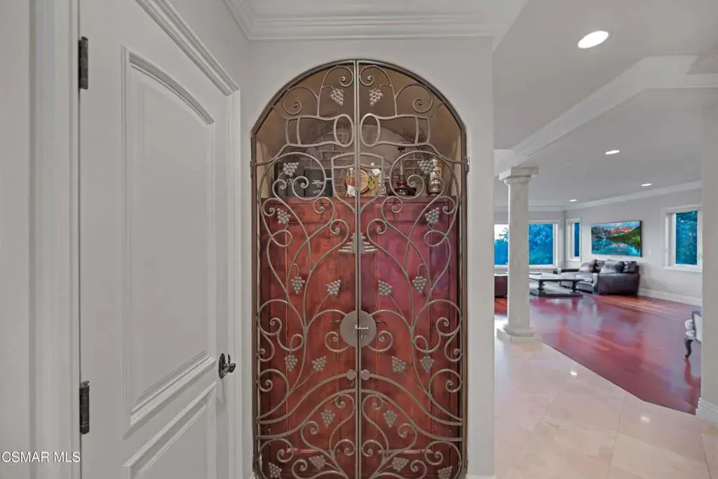 The stage is set for this magnificent custom-built estate in one of the most coveted neighborhoods of Santa Rosa Valley, a truly world-class Camarillo property showcasing breathtaking panoramic views that rank among the finest in all of Ventura County. Spanning approximately 4,600 sq. ft., this rare 6-bedroom, 6-bath luxury residence blends Tuscan warmth with refined elegance and has been meticulously updated with the highest-quality custom finishes throughout. Set on an expansive 1.31-acre lot, the home is a car enthusiast’s dream, featuring a 5-car garage (3-car attached plus an oversized 2-car detached garage/workshop with its own A/C and half bath), extensive RV and boat parking, a 50-amp EV charging port, and ample space for additional vehicles. The downstairs living space offers an open floor plan with soaring ceilings, Italian travertine tile and warm wood flooring, two primary suites with spa-like bathrooms and custom walk-in closets, spacious guest rooms with vaulted ceilings, updated baths, an oversized chef’s kitchen with granite countertops, Wolf range, GE Monogram refrigerator/freezer, beverage fridge, bar seating, a custom oak wine cellar with wrought-iron gates, and a large laundry room. Upstairs, a spacious loft/library with fireplace, a stunning balcony with sweeping views, and a third primary suite with dual walk-in closets and a luxurious bathroom further elevate the home. Modern smart-home features include a SONOS speaker system with individual room controls, Wi-Fi mesh system, whole-home entertainment integration, and a Jandy remote pool system. Outside, the private, multi-tiered grounds are an entertainer’s paradise, offering a long rebar-reinforced private driveway, expansive grassy play area, mature landscaping with fruit trees and herb garden, BBQ area, multiple outdoor lounge spaces, paid-in-full solar with 43 panels, and a show-stopping infinity pool with Idaho stone spillover and spa–an unmistakable toast to luxury living at its finest.