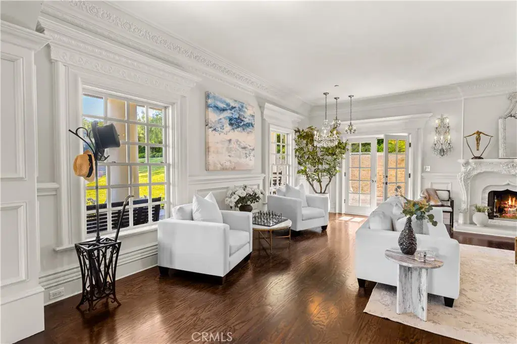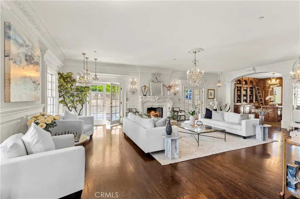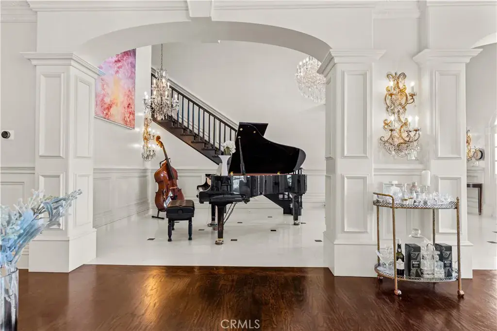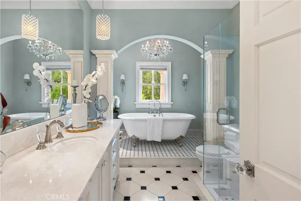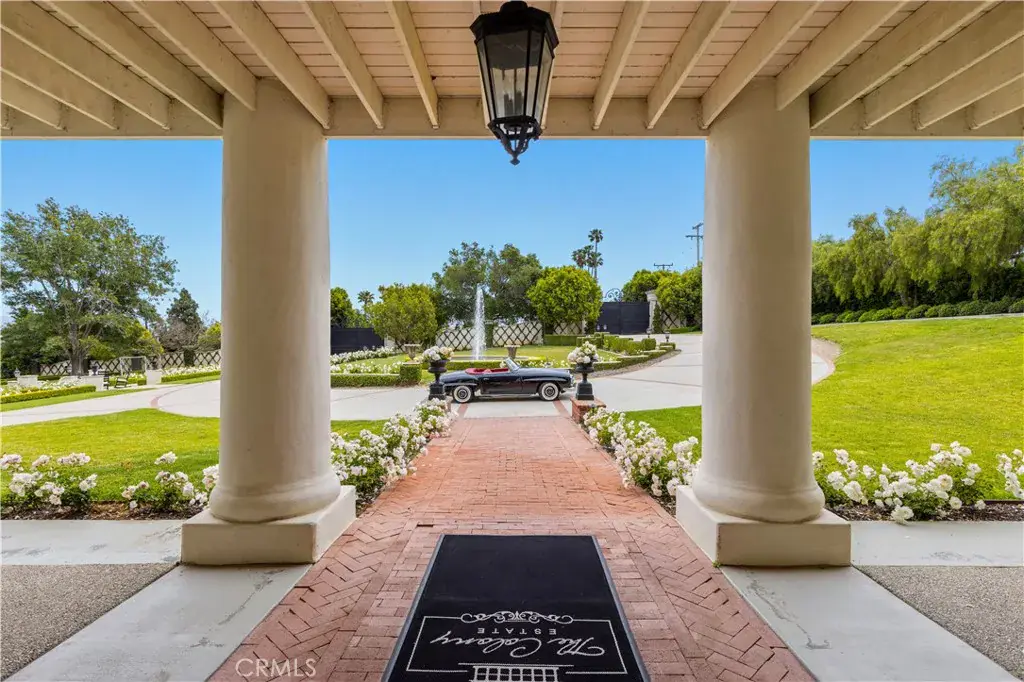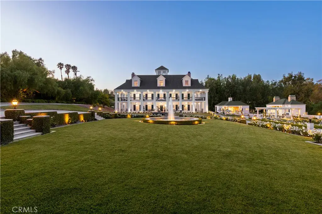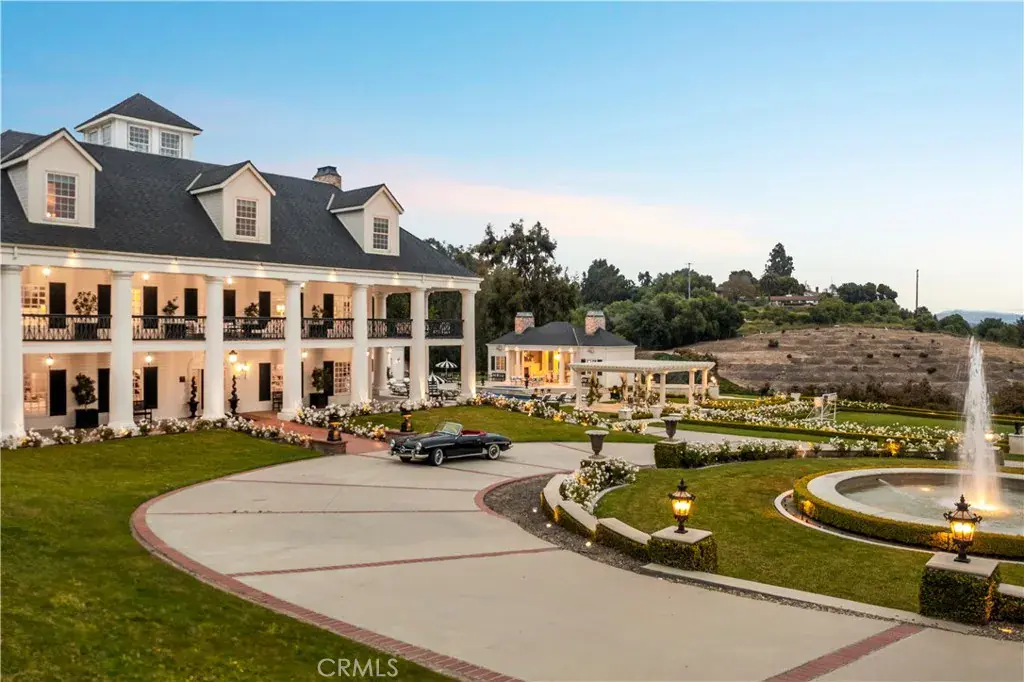 Palatial colonial-style main residence with 35-foot entry ceilings, library, gourmet kitchen, formal dining room, and expansive entertainment areas