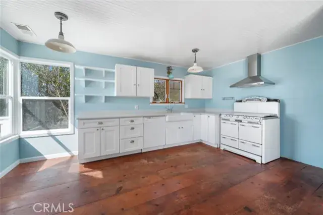 Upstairs, an open-concept layout designed for entertaining includes a living room with a wood-burning fireplace that opens to a spacious deck with breathtaking ocean views. The dining area flows seamlessly into a kitchen that blends retro charm with modern convenience—complete with a farmhouse sink, vintage stove and oven, classic range hood, modern dishwasher, and plenty of counter space.