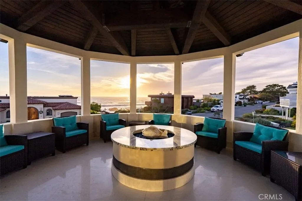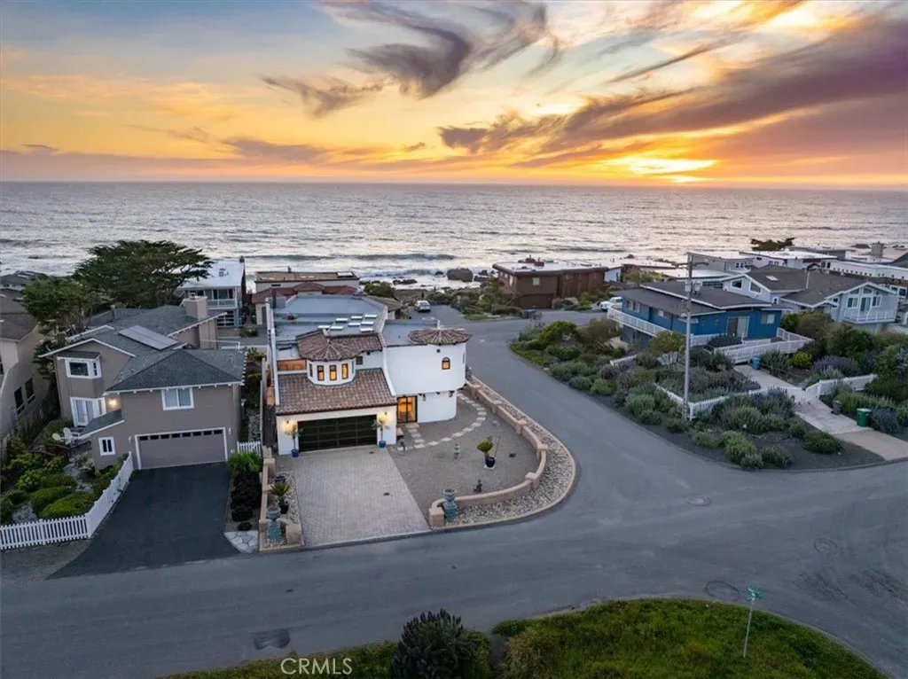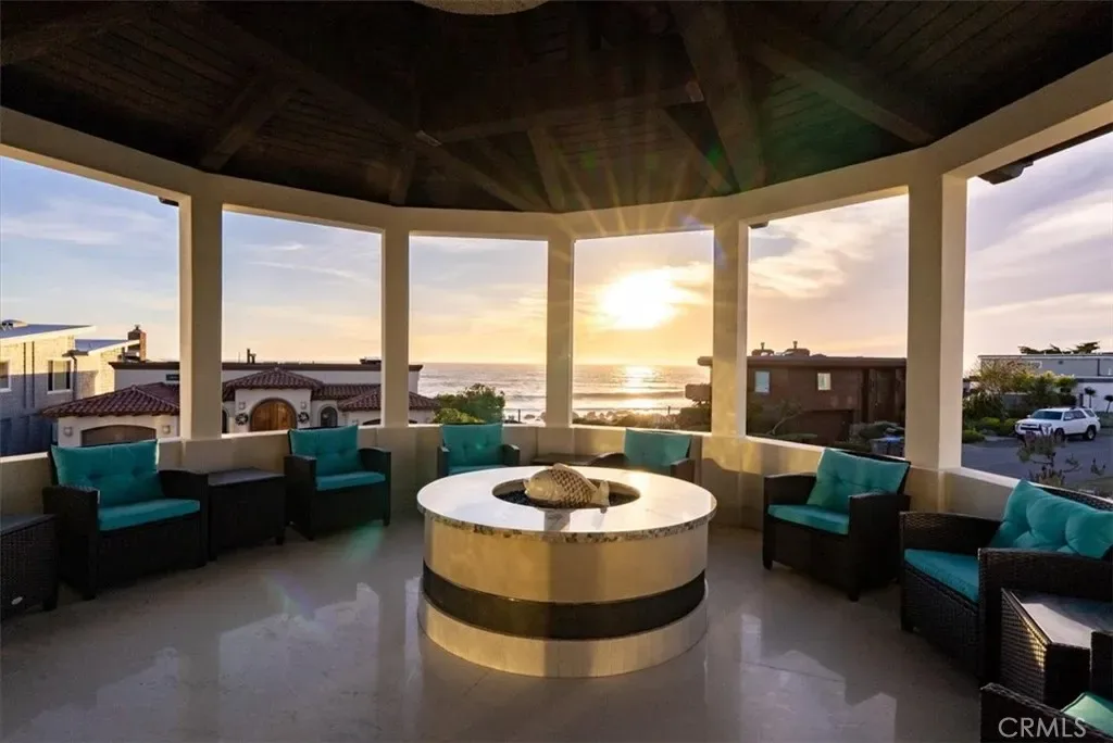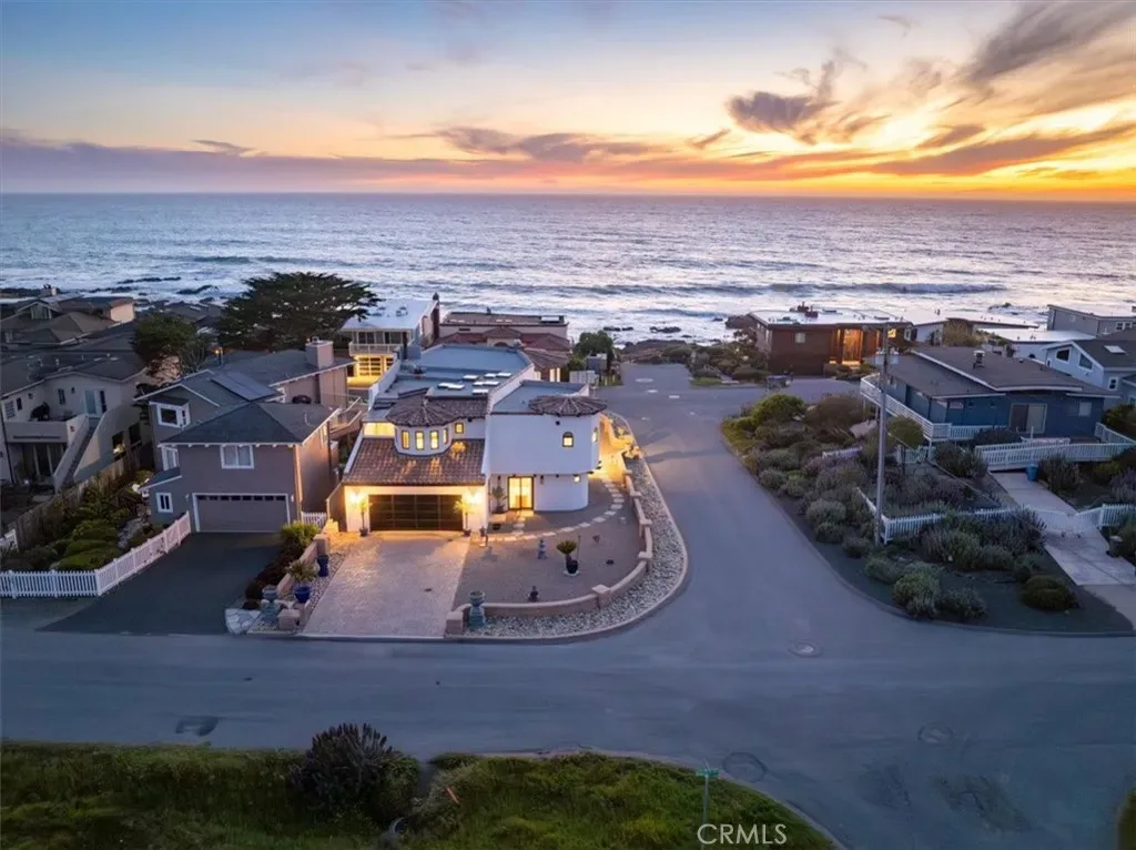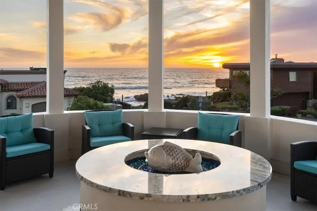 Extraordinary coastal living unfolds along one of Cambria’s most desirable streets, where sweeping white-water views and the rhythm of the Pacific define the experience of this thoughtfully designed residence. Encompassing approximately 2,961± square feet, the home offers 4 bedrooms and 4.5 baths, each space carefully composed to balance comfort, privacy, and refined coastal style. The interiors are anchored by an expansive great room where living, dining, and kitchen areas come together seamlessly, framed by wide windows that draw in natural light and capture the dramatic coastline beyond. At the center of the home, the kitchen is both functional and artful, featuring a striking solid glass island custom-designed and signed by a world-renowned artist, complemented by high-gloss cabinetry and premium appliances, including an Italian gas range and built-in convection oven and microwave. Throughout the home, porcelain tile flooring with hand-crafted stone inlays, dramatic lighting, and a lodge-style gas fireplace create a warm yet sophisticated atmosphere. A defining feature of the residence is the seamless transition to outdoor living, where La Cantina folding glass doors open fully to an ocean-view lanai. Here, a built-in gas fire pit becomes the focal point for evenings spent overlooking the coastline, with sunsets and ocean breezes providing a constantly changing backdrop. The primary suite offers a quiet retreat, complete with a private balcony accessed through mahogany French doors, where elevated views of the ocean create a sense of calm and privacy. The spa-inspired bath is finished with a tiled shower and freestanding soaking tub, reflecting the same attention to detail found throughout the home. Additional features include mahogany interior doors with polished chrome accents, designer bath finishes, expansive wall space for art, an outdoor shower, and a two-car garage. Located just moments from the scenic trails of the Fiscalini Ranch Preserve, the property offers convenient access to one of the Central Coast’s most treasured natural landscapes. A distinctive coastal residence where thoughtful design, exceptional craftsmanship, and Cambria’s dramatic setting come together in a truly refined coastal retreat.