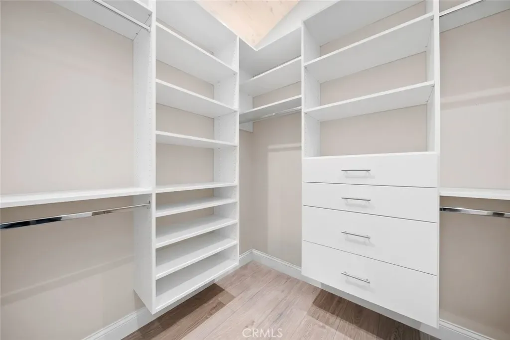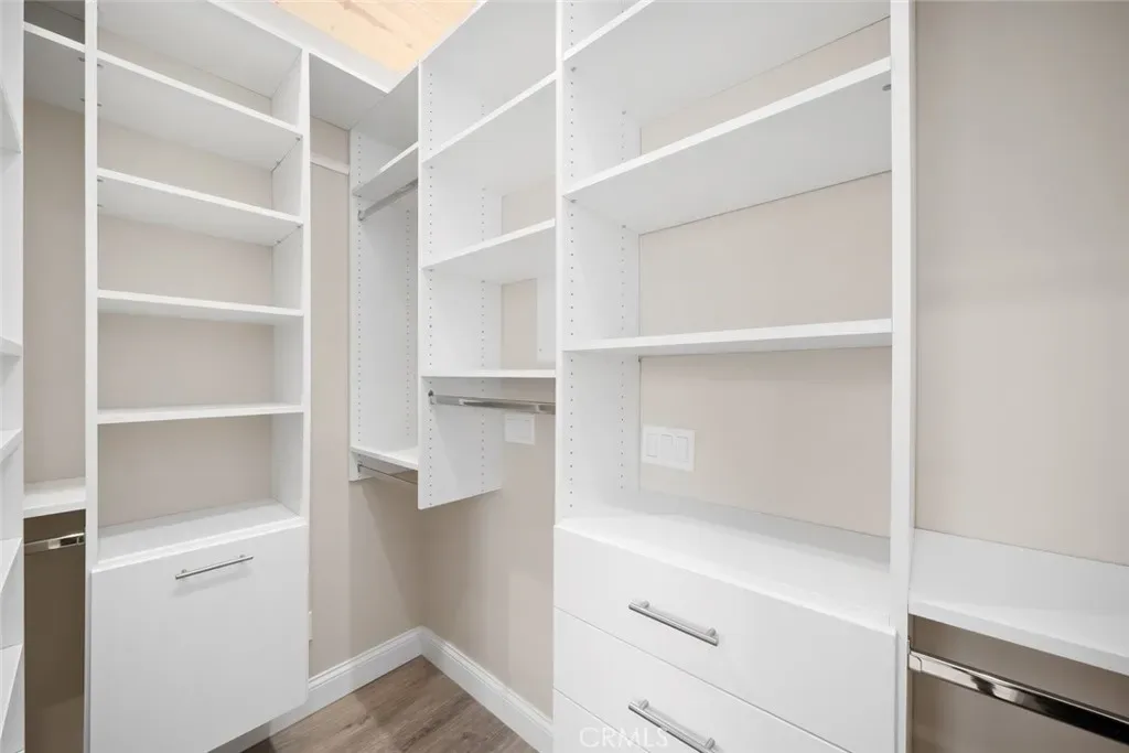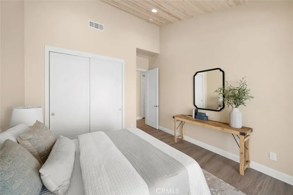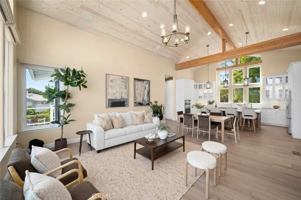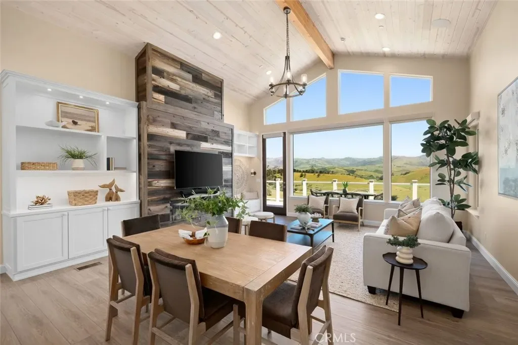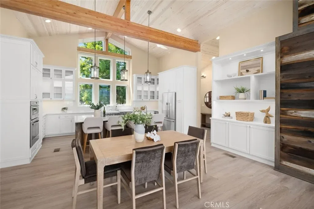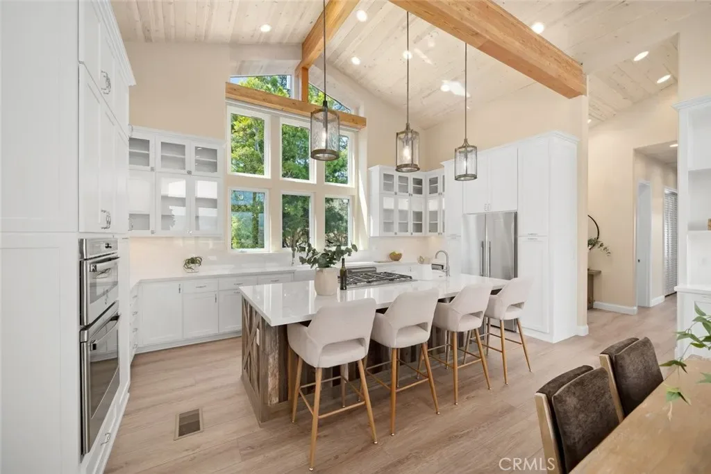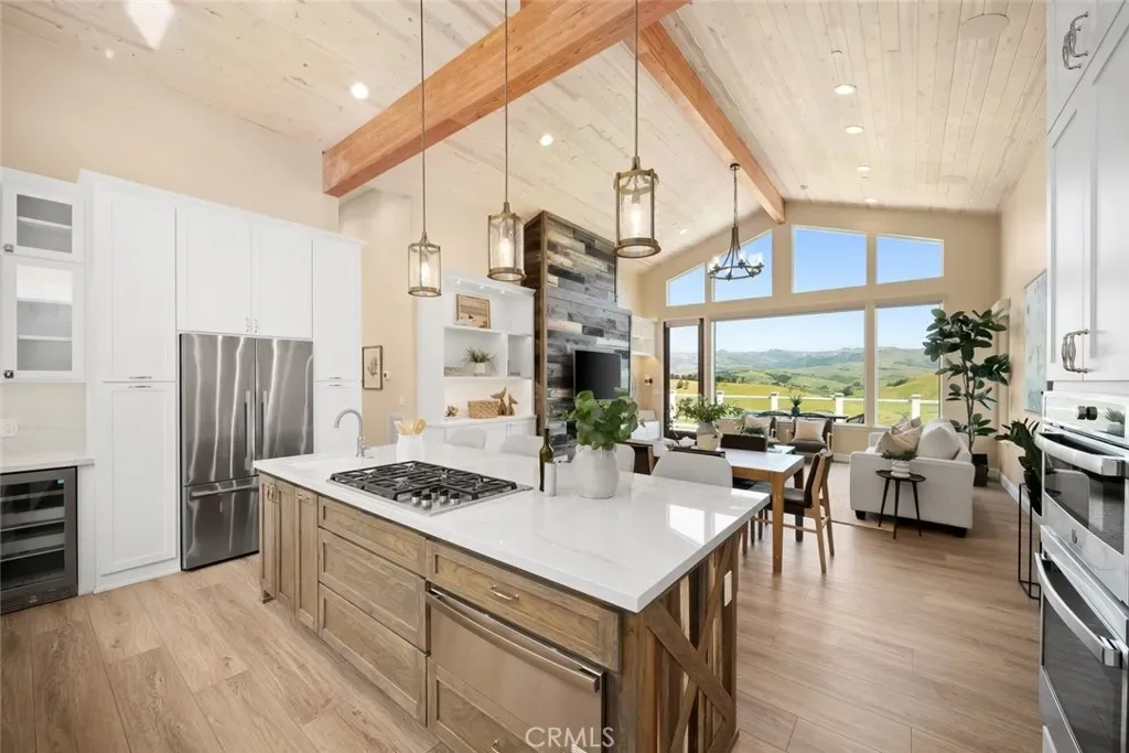 Inside, the open-concept floorplan is both functional and stunning. The living room is a true centerpiece, showcasing a dramatic wall of windows, a 16-foot vaulted ceiling, custom built-ins, and a striking fireplace. Luxury vinyl plank flooring flows throughout the main living areas, enhancing both durability and style. The kitchen is beautifully appointed with quartz countertops, custom cabinetry, and top-of-the-line stainless steel appliances including a gas cooktop, convection oven, conventional oven, warming drawer, beverage refrigerator, and dishwasher. A spacious center island with seating anchors the space, ideal for gathering and entertaining.