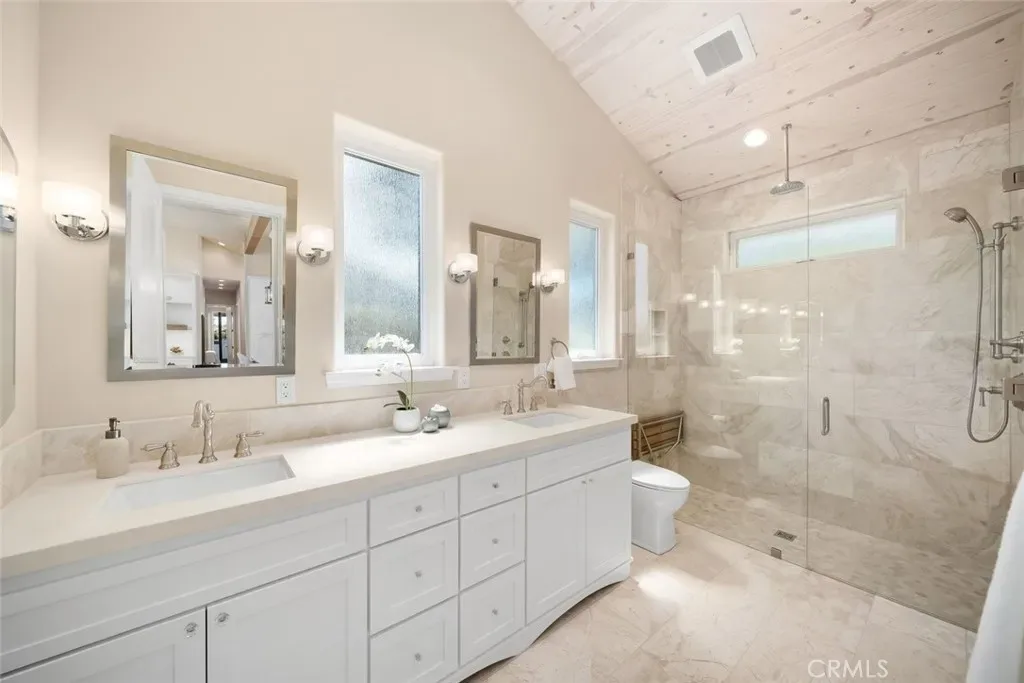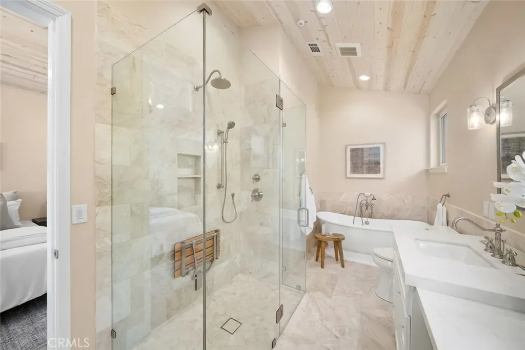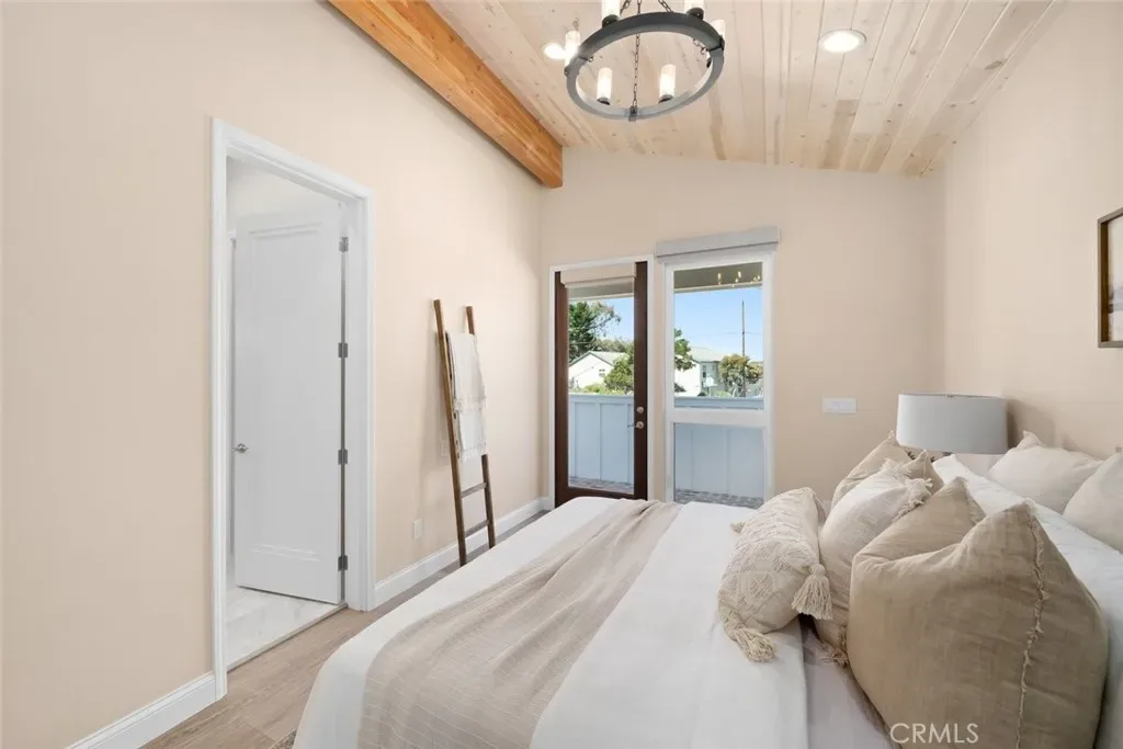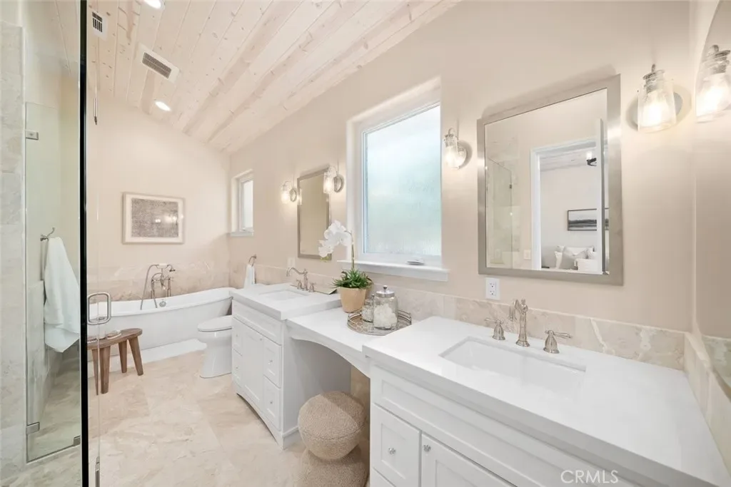 The split-wing layout provides privacy and flexibility. The primary suite is a serene space with private deck access, a spa-inspired ensuite bath with soaking tub, walk-in shower, dual-sink vanity with seating area, and a generous walk-in closet. On the opposite wing, two additional bedrooms, each with deck access, are complemented by two full bathrooms, offering comfortable accommodations for family or guests.