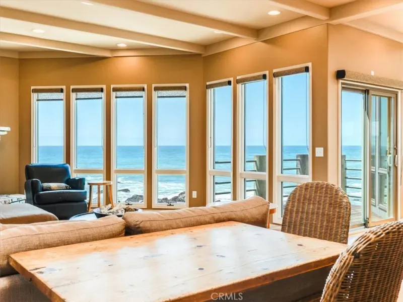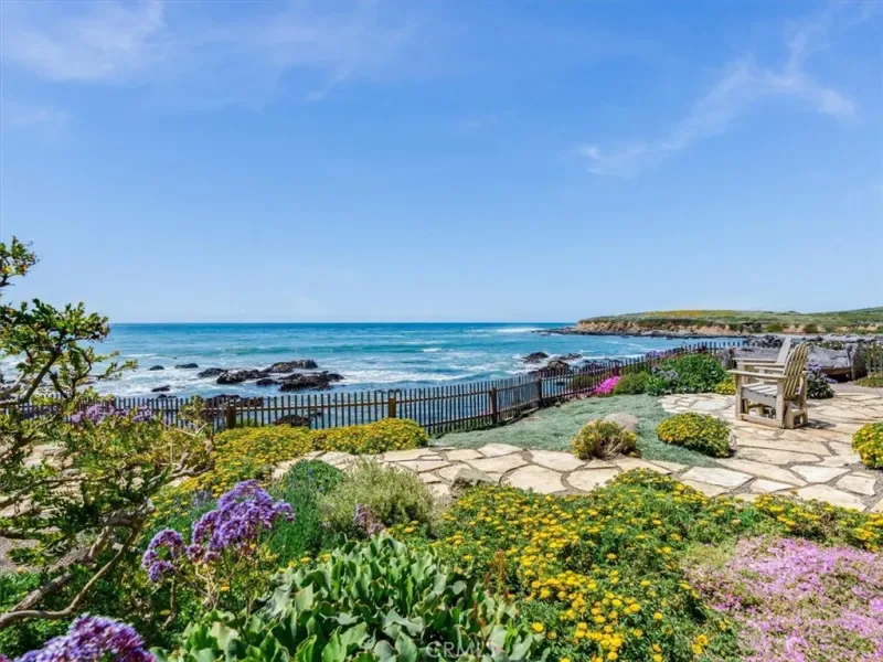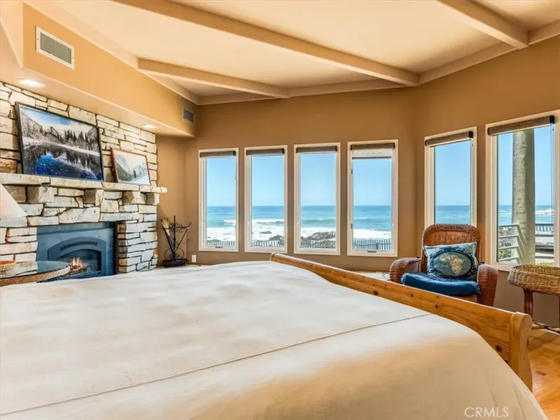 Welcome to your ultimate coastal escape—where unmatched, unobstructed panoramic ocean views take center stage in this stunning multi-level 3-bedroom, 3.5-bath home with 2,130 sq ft of living space on a 6,417 sq ft oceanfront lot. Floor-to-ceiling windows span the entire back of the home, flooding nearly every room with natural light and breathtaking views of the Pacific. The entry-level features a welcoming foyer, a spacious bedroom with full bath, and access to the attached garage. Upstairs, the main living level showcases a seamless blend of indoor-outdoor living with expansive ocean vistas from the living room, dining area, and chef’s kitchen—complete with top-tier appliances, custom fossil-inlaid backsplash, and breakfast bar seating. A cozy fireplace with stone hearth, wet bar, and sliding glass doors to the ocean-facing deck create the perfect setting for relaxing or entertaining. A powder and sitting room complete this level. Downstairs, the lower level features a second bedroom with ensuite bath, laundry room, and the primary suite, where sweeping ocean views, a fireplace, window seat, and a luxurious spa-style bath with jetted tub, separate shower, and private sauna await. Outside, the back patio is thoughtfully designed with slate pavers winding through multiple view-focused seating areas, while a stone stairway leads directly to the beach and tide pools below—offering a rare and immersive coastal experience. This exceptional home presents a rare opportunity to own front-row, forever ocean views—ideal as a full-time residence or luxurious second home. Just minutes from Cambria’s charming village, with boutique shops, wine tasting, fine dining, and year-round events. An extraordinary opportunity to own one of Cambria’s most breathtaking oceanfront properties—where every day begins and ends with endless horizon views.