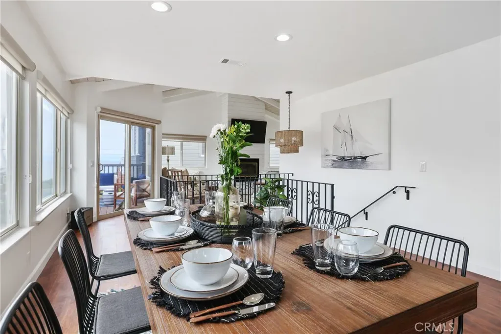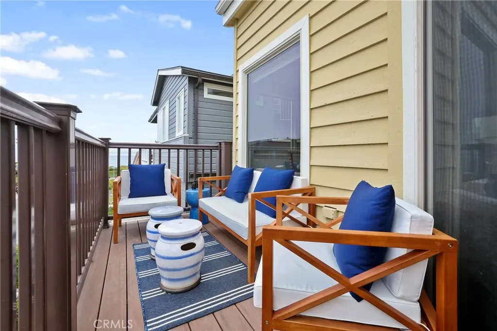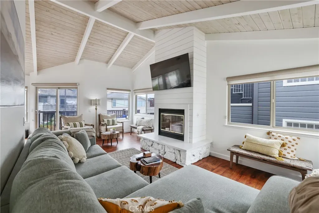 Bright, clean, and filled with natural light, the home blends modern comfort with timeless coastal charm. The classic white kitchen features elegant countertops, bar seating, and ample storage. A spacious dining area is surrounded by tall windows, while the living room showcases exposed wood beams and a cozy fireplace. Step out onto the balcony to enjoy partial ocean views and cool sea breezes.