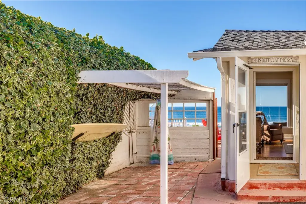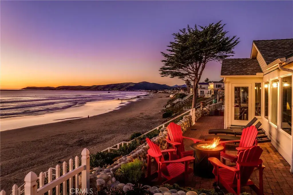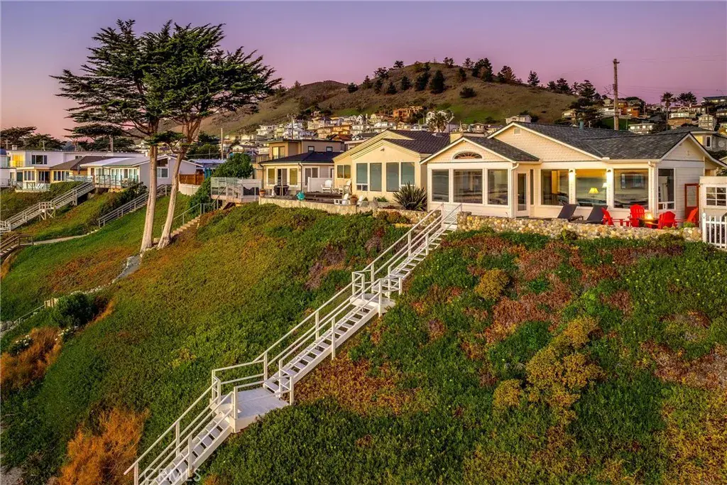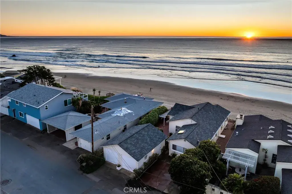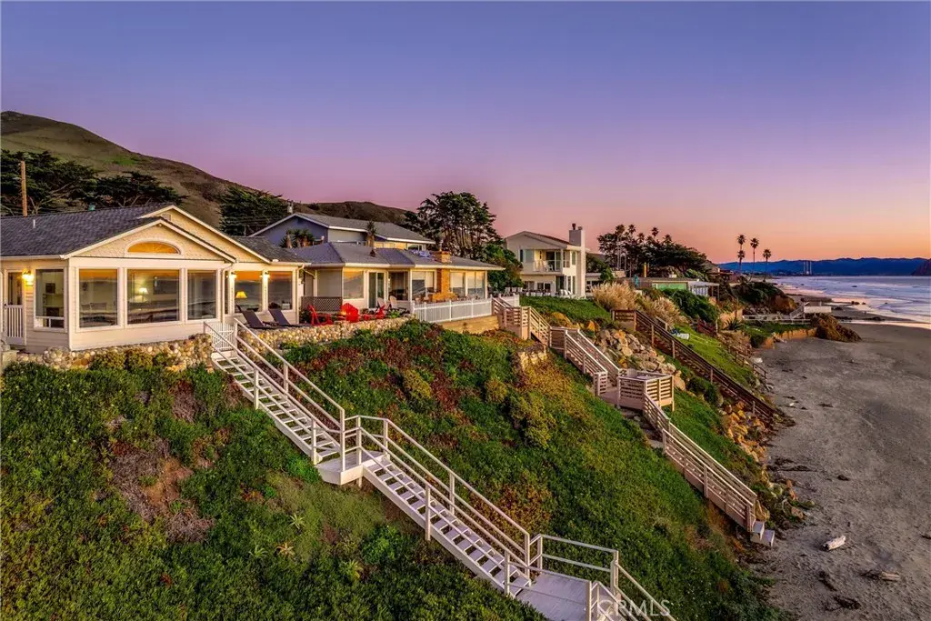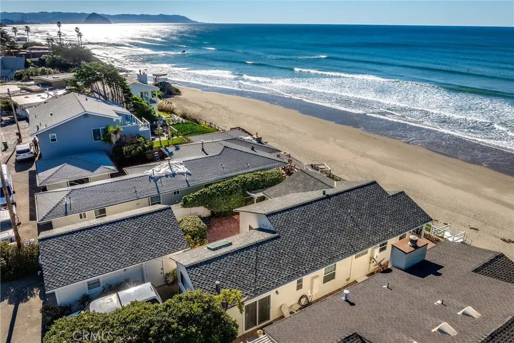 Rare oceanfront offering. This distinctive two-lot parcel comprises approximately 7,400± square feet, with 50 feet of ocean frontage and over 145 feet of depth. Situated closer to the bluff edge than neighboring residences, the property enjoys sweeping point-to-point coastline views and dramatic white-water vistas, enhanced by offshore rock formations. A set of finely crafted private stairs descends through an ice plant–covered bluff to a broad sandy beach below. The property includes a street-side two-car garage with additional storage, along with separate guest quarters, offering flexibility for visitors, extended family, or private accommodations. Beyond the garage is a sheltered interior patio well suited for container gardening, a spa, or outdoor entertaining. The main residence is accessed from the patio and opens into a full-width great room featuring vaulted ceilings, expansive glass, and an open-concept living, dining, and kitchen area. Wood flooring and detailed ceiling insets contribute warmth and architectural interest, while ocean views are enjoyed throughout the primary living spaces. The main living area includes a fireplace, ceiling fan, and a stackable washer/dryer discreetly located in a living room closet. The efficient kitchen is appointed with granite countertops, updated cabinetry, and stainless steel appliances. The dining area is highlighted by an arched window and plank-style ceiling. The main residence offers two bedrooms with ample natural light, including one generously sized to accommodate twin beds, along with a full bathroom featuring a pedestal sink. A wide bluff-top patio extends from the living area and provides direct access to the private beach stairs. This rare oceanfront parcel, combined with private beach access, expansive views, and separate guest quarters, presents a truly unique coastal opportunity