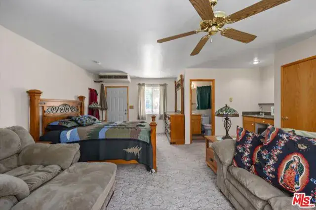 Built in the mid-60s, the two-story dwelling with a studio/in-law suite stands in the quaint town of Kernville, a few hours north of Los Angeles, where everything from wilderness hiking to whitewater rafting is outside your front door. In addition, the property includes access to Bubbles Beach. It’s a private beach moment away that’s reserved for River kern property owners, where you have riverfront access to spend a relaxing afternoon along the sandy banks of the mighty Kern River. When you are at home, the main level of the two-story dwelling features a floor-to-ceiling brick fireplace in the living room, a dining area that provides a spot for morning coffee and homemade meals, and a roomy den with a Malm-style fireplace. The yard awaits your green thumb. There’s income potential with the studio above the garage. It has a separate entrance and combines a bedroom, kitchenette, and work area with bay windows looking toward the mountain tops.