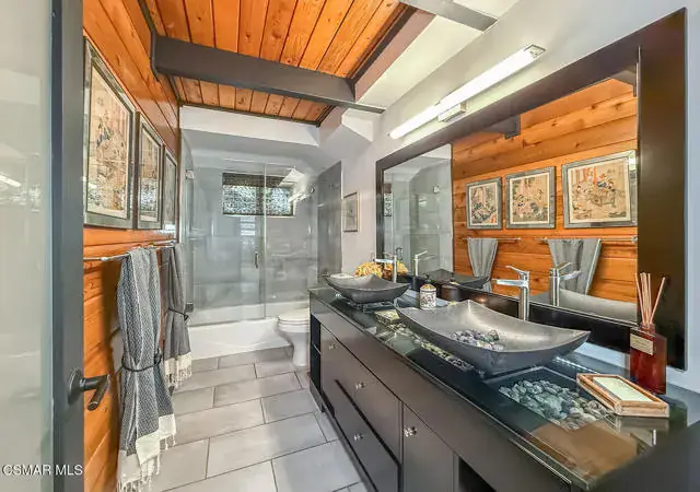 A Rare Lake Sherwood Treasure — Offered for the First Time in Over a DecadeThis spectacular lakefront home offers sweeping panoramic views of Lake Sherwood and is now available after 10 cherished years with its current owner. Designed with a striking blend of cedar and glass, the home features six serene outdoor areas that invite you to relax amid the natural beauty of the lake, majestic oaks, and the Santa Monica Mountains.With approximately 2,808 sq ft of living space, this 3-bedroom, 3-bath residence is a warm, welcoming retreat. Soaring wood-beamed ceilings and expansive walls of glass define the main living area, where an open-concept layout seamlessly connects the family room, dining space, and a quartz-topped center-island kitchen — all flowing out to a generous front deck with stunning lake views.The lower level offers a flexible bonus suite with three distinct sections: a mirrored studio with closets, a full bathroom with shower, a laundry room, a gym, and a media room with an oversized projection screen — perfect for movie nights or game-day gatherings.Step outside and follow the path to your private dock, complete with a motorized Catalina sailboat, kayaks, and a stand-up paddleboard — your gateway to year-round bass fishing, sunset cruises, and peaceful waterfront living.Enjoy full lake rights, including access to all reserve strip areas, the beloved Maid Marian Park, and easy travel by foot, car, or golf cart to both Lake Sherwood Country Club and Sherwood Lake Club.And best of all — no HOA dues. A modest lake use charge applies.This is more than a home. It’s a lifestyle. Come and experience the sense of calm and wonder that greets everyone who steps into this one-of-a-kind lakeside sanctuary.