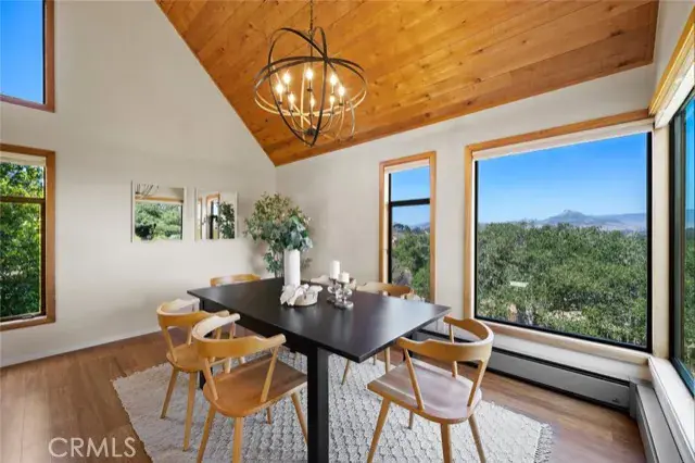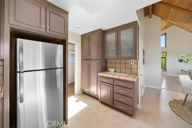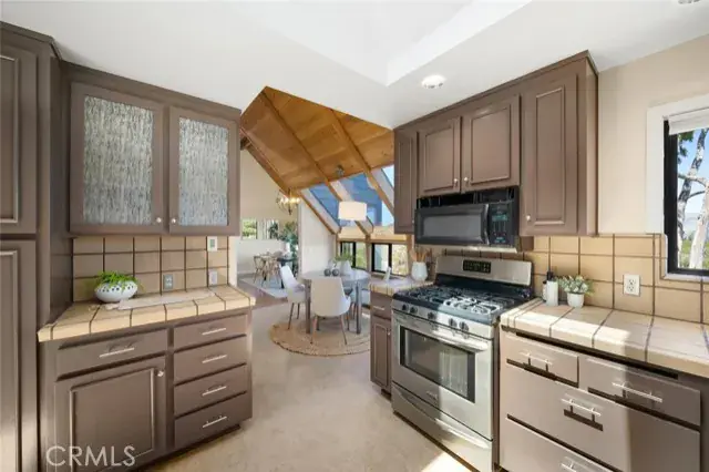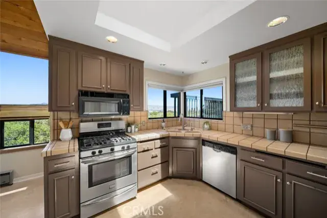 The third level offers a formal living and dining area featuring soaring wood ceilings, a decorative chandelier, and panoramic vistas. The spacious eat-in kitchen continues the spectacular western views and is equipped with a gas stove, vent hood, microwave, refrigerator, dishwasher, and ample cabinetry accented by beautifully tiled countertops. A coffee bar counter and pantry make this space ideal for both casual mornings and entertaining.