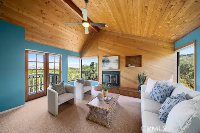 A cozy family room down the hall features a fireplace, large view windows, and French doors that open onto a private balcony—perfect for morning yoga or evening relaxation. A half bath completes this level.