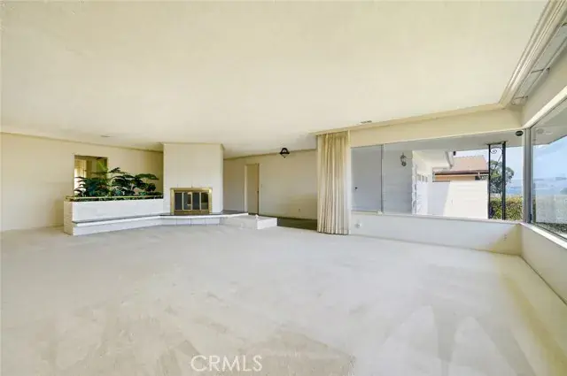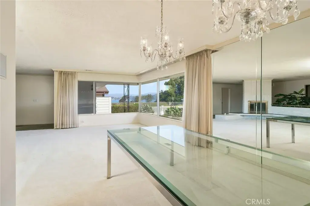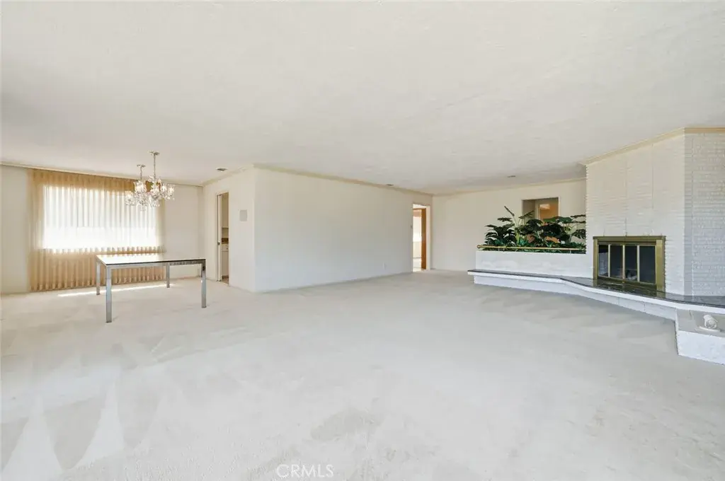 Step into the spacious main living area, where sweeping views steal the spotlight through expansive picture windows. A wood-burning fireplace with a uniquely designed floating hearth and partial room divider adds warmth and architectural interest.