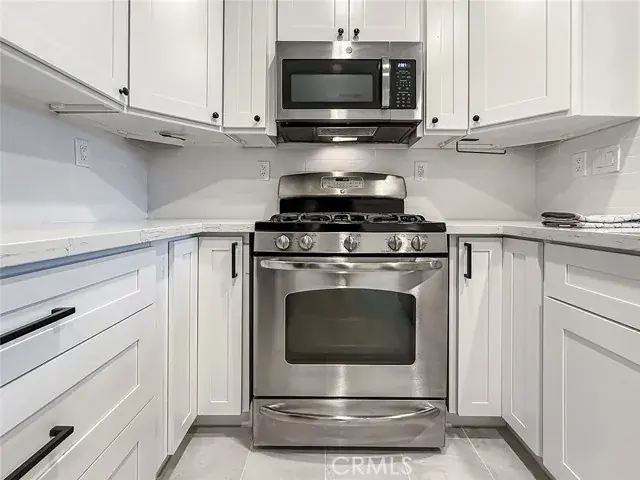 The recently renovated kitchen features modern stainless steel appliances, quartz countertops, and elegant shaker-style cabinetry with abundant storage. Throughout the home, large windows and high ceilings with recessed lighting create a bright, airy atmosphere. Wood flooring and updated baseboards add a fresh, contemporary feel, complemented by brand-new luxury carpet in the entryway and bedrooms.
