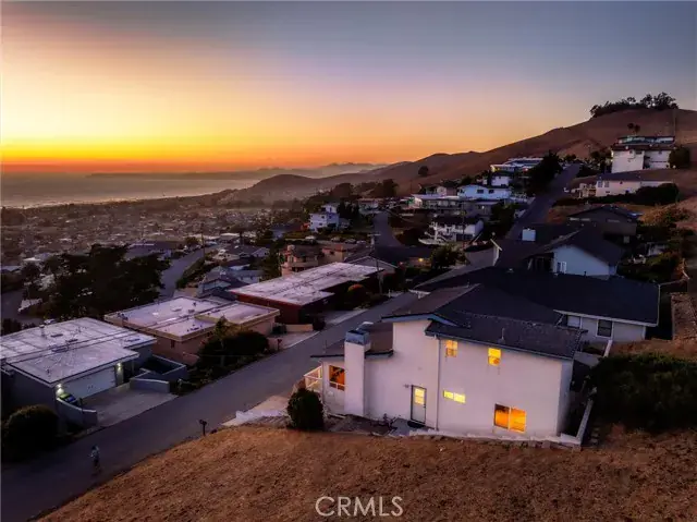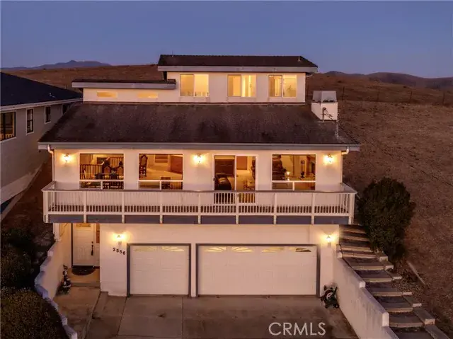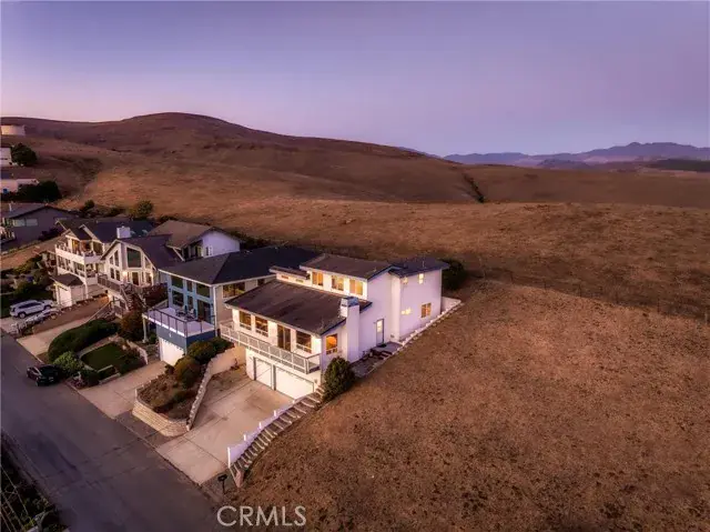 Spectacular panoramic ocean views stretch from Cayucos to Montana de Oro with peaceful ranch land behind—truly the best of both worlds. This 3-bed, 3-bath, 2,200 sq ft home boasts an open floor plan where the kitchen flows effortlessly into the living spaces, complete with a large prep island, tiled wrap-around breakfast bar, pantry, and ample cabinetry. The living room features a cozy fireplace, soaring ceilings with recessed lighting, corner windows framing iconic Morro Rock, and sliding doors leading to a view deck. Spacious enough to accommodate both casual lounging and a formal dining table, the living area is designed for entertaining. The primary suite lets you watch whales from bed, with a spa-like bath offering dual sinks, a soaking tub, and walk-in closet. A secondary en suite also captures ocean and Rock views, while the third bedroom is conveniently located near the third full bath. Extras include an oversized three-car garage, individual laundry with folding station, and low-maintenance stucco exterior—an ideal blend of comfort, design, and coastal lifestyle.