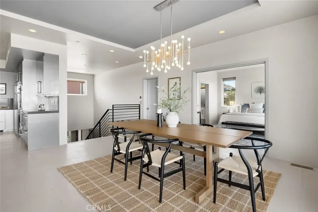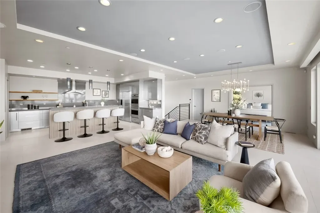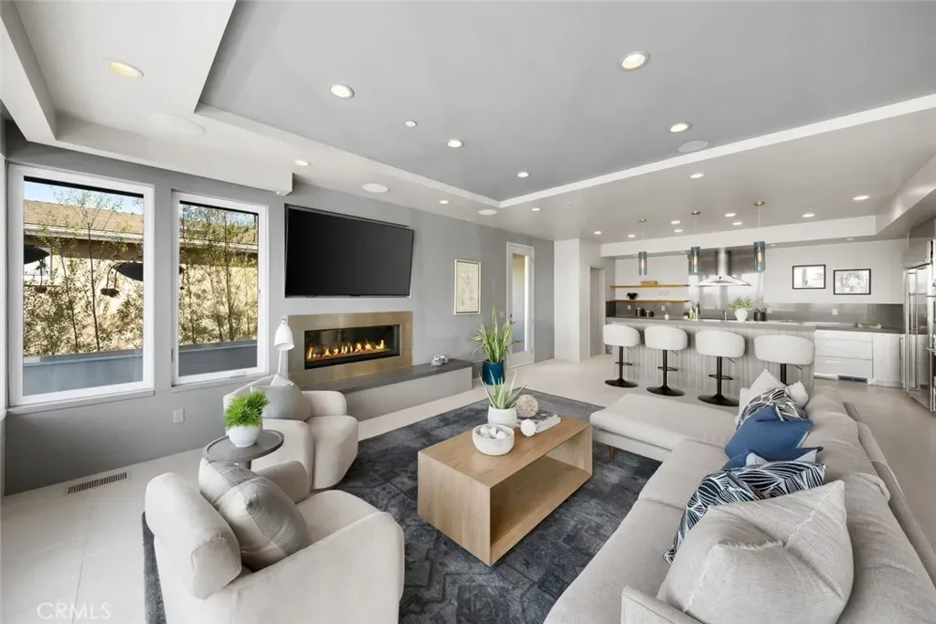 Upstairs, the home opens into a light-filled, open-concept living space designed to maximize breathtaking ocean views of the Morro Bay coastline. The living room, anchored by a gas fireplace, flows seamlessly into the dining area and a chef-inspired kitchen featuring a large center island with seating, stainless steel appliances, a six-burner gas range with hood, double ovens, and a spacious walk-in pantry. A wall of windows and sliding glass door lead to an expansive ocean view deck, perfect for soaking in coastal breezes and spectacular sunsets, with direct access to the backyard below.