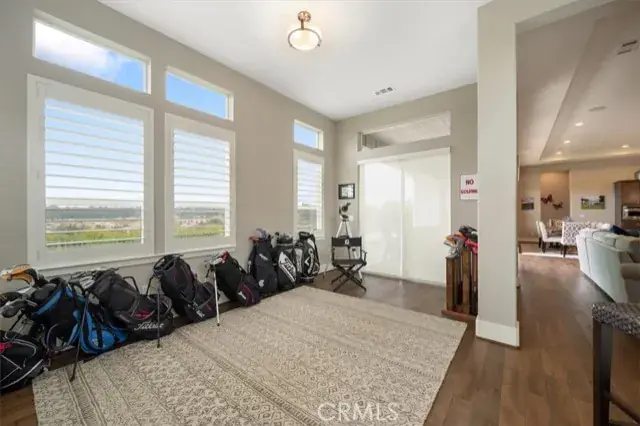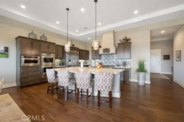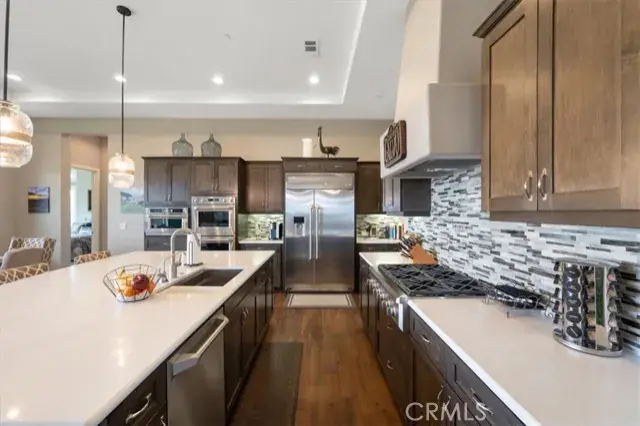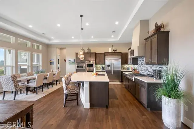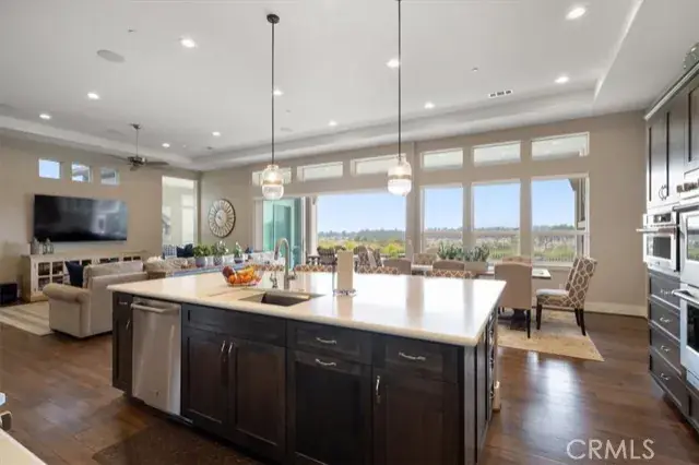 The open-concept layout features soaring ceilings, designer finishes, and expansive windows that frame the stunning scenery. A chef’s kitchen showcases GE Monogram appliances, including a built-in refrigerator, 6-burner gas range, double ovens, and a walk-in pantry. The oversized quartz island provides the perfect centerpiece for gatherings, seamlessly connecting to the dining and living areas.