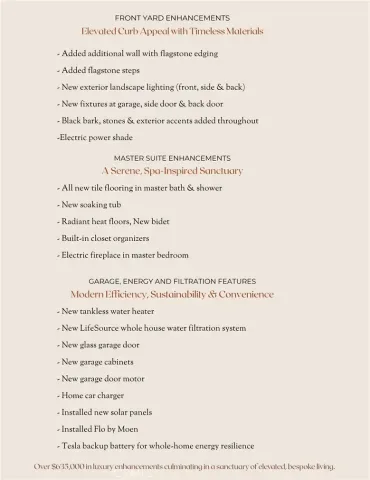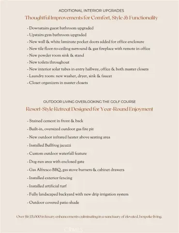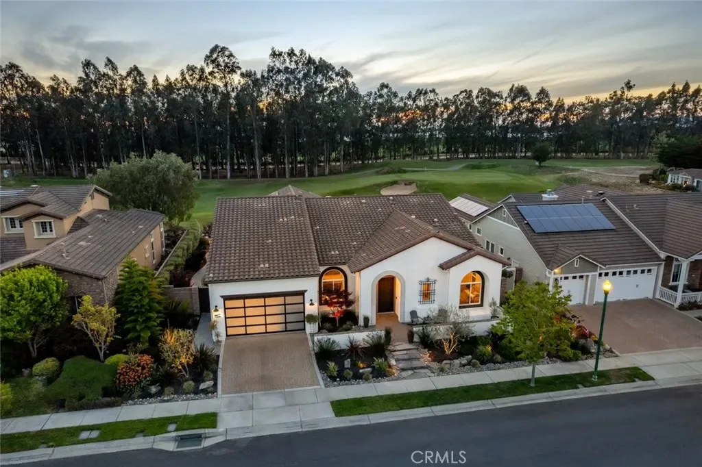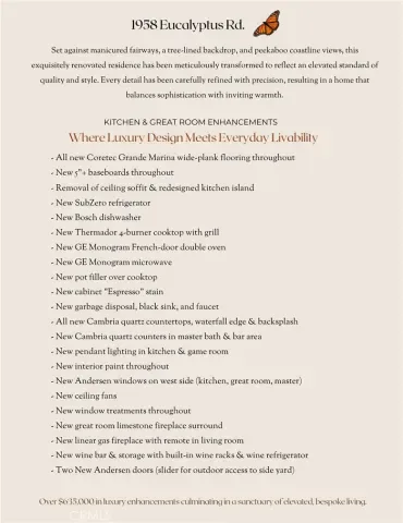 A Rare Blend of Curated Design and Luxury Central Coast Living. 1958 Eucalyptus Road is set along a manicured fairway, framed by a lush tree-lined view and coastline glimmers. This residence has been transformed with over $600,000 in upgrades and features, into an elevated California lifestyle. The experience begins the moment you arrive, unique landscaping design, exterior lighting and featuring a modern garage door. Enter to all new flooring, custom paint, lighting, ceiling fans and a chef’s kitchen that is nothing short of a culinary masterpiece—Cambria quartz waterfall island and counters, new appliances and a pot filler create a chef’s kitchen designed not just for meals, but for moments. New west-facing, Andersen doors & windows draw the eye outward to a magical array of golf course vistas, swaying trees, sunsets and the distant ocean. Fireplaces flicker throughout the residence—each one a vignette of comfort and atmosphere. In the great room, the family room, the primary suite, and even outdoors, these glowing focal points create the range from, a perfect morning coffee to evening gatherings. The primary suite offers a spa inspired bathroom retreat with radiant heated floors, soaking tub, walk-in shower, bidet, and walk-in closet. Outside, the property transforms into a private resort—an escape designed for relaxation, celebration, and year-round enjoyment. A custom waterfall feature, oversized fire pit, infrared heater, Alfresco BBQ kitchen, spa and lush, low maintenance landscaping create an environment that feels both luxurious and effortless. Additional features include solar panels, Tesla backup battery, tankless water heater, LifeSource whole house filtration, EV charger, Solar Tubes, new laundry appliances, custom bar with built-in wine refrigerator and racks, 5″ baseboards, entertainment center wall, French doors at office and much more. Elevated design and luxury living in one of the area’s most desirable resort communities.