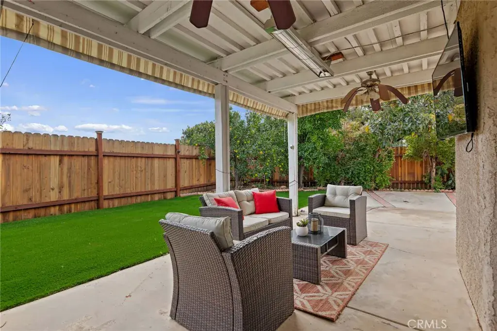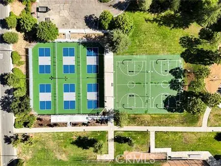 The backyard is a true oasis with updated fencing, low-maintenance turf, a covered patio, a basketball court, and fruit trees bearing lemons, limes, oranges, and tangerines. The oversized garage includes laundry, extra storage, and a Tesla charger. The HOA covers front yard maintenance and offers a community pool and spa.