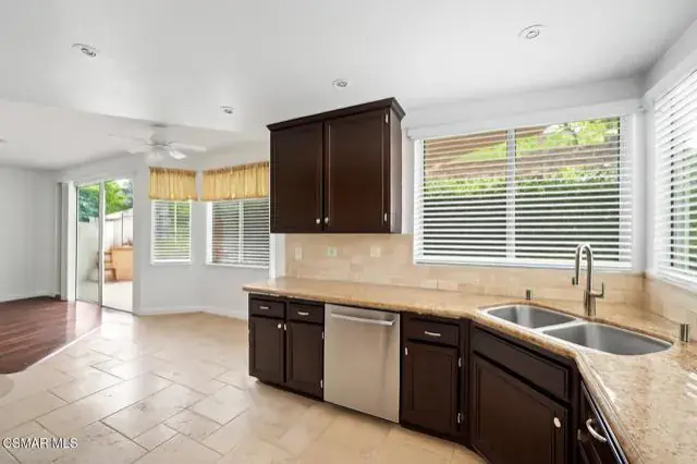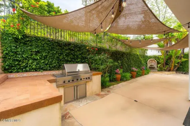 Located in the prestigious Hillcrest Estate community, this Oak Park gem offers an ideal blend of suburban tranquility and urban convenience. Perfectly positioned in the city’s heart, this residence is within close proximity to an array of restaurants, shops, and a Starbucks. This luminous home boasts an open floor plan with vaulted ceilings, flooding the interior with natural light. The well-maintained 3-bedroom, 2.5-bathroom home features elegant upgrades, including exotic walnut hardwood floors, a new roof, and a built-in alarm system. The updated gourmet kitchen, equipped with granite countertops, professional-grade Thermador stainless steel appliances, and travertine flooring, flows seamlessly into the adjacent breakfast nook, family room, and backyard. The family room, adorned with a marble and travertine fireplace, offers a picturesque view of the beautifully landscaped backyard, designed for effortless entertaining. The private backyard is a true oasis, featuring a large built-in barbecue area with an outdoor refrigerator, mature vines draping the walls, and a charming corner fountain that evokes a vacation-like ambiance. The spacious primary bedroom showcases vaulted ceilings, a double-sided fireplace, and a luxurious en-suite bathroom with dual sinks, a walk-in closet, a large tub, and a separate shower. Upstairs, two additional bright and generously sized bedrooms have access to a full bathroom with a bathtub/shower combo. Attention to detail is evident throughout, from the stone walkway and patio to the mature landscaping and recessed lighting, all contributing to the home’s warm and inviting atmosphere. With top-rated schools, hiking, biking trails, and parks nearby, this residence perfectly combines comfort, prime location, and convenience.
