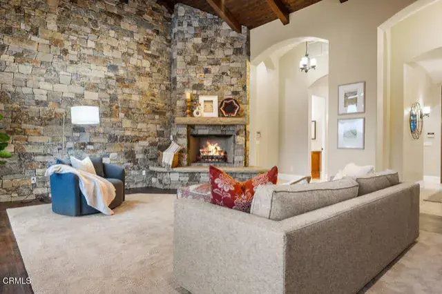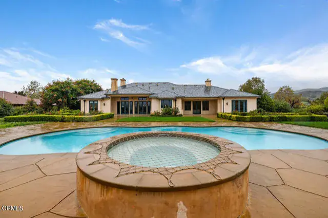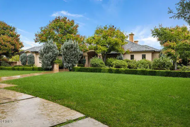 Designed by renowned architect Braden Sterling, this timeless French Provincial estate blends refined craftmanship with the serenity of wide-open Ojai Valley landscapes. Set on 2.1 private usable acres with unobstructed panoramic views of the iconic Topa Topa Mountains, this 4,244 sq ft residence offers five bedrooms, four bathrooms, and every amenity for luxurious indoor-outdoor living.French doors line the back of the home, opening to a resort-style backyard complete with a sparking swimming pool, adjoining spa and cozy fire pit—all framed by rose gardens, raised vegetable beds, and an orchard of mature fruit trees. The property also features two outbuildings, each with a retractable roof, ideal for creative pursuits or flexible workspaces. With room for horses and direct access to the Ojai River Preserve trails and Los Padres National Forest, this is true California living at its finest.Inside, the open, light-filled floorplan showcases high beamed ceilings, tile and hardwood flooring throughout much of the home, and a welcoming chef’s kitchen that flows into the great room perfect for entertaining. The indulgent primary suite is a private retreat, featuring dual walk-in closets, serene views, and a spa-like bathroom. Two wings of the home are dedicated to guest or family bedrooms, ensuring privacy and comfort. Three fireplaces add warmth and character, while fire sprinklers throughout provide peace of mind. Additional highlights include a private well, slate roof, and a large storage room off the garage.Quiet, private, and perfectly positioned to capture sunrise and sunset views, this estate is a rare opportunity to own a piece of Ojai serenity.