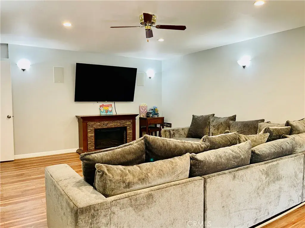 Fully finished basement featuring a gaming area, half bath, home theater with surround sound, 75” flat-screen TV, sectional couch, and an elegant electric fireplace