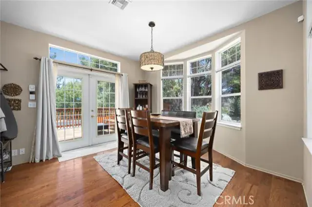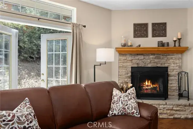 The kitchen and dining area open to the front deck, with a bay window framing views of the trees. In the living room, a stacked stone fireplace and French doors that lead to a private side area of the home—perfect for quiet afternoons.