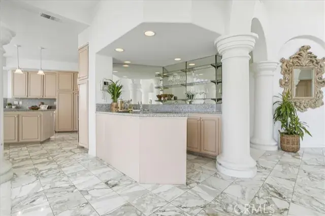 Elegant, single level, hillside home in Pismo Beach with sweeping ocean views. This three bedroom, three bath Central Coast home is open, inviting, and filled with natural light. The grand entry has beautiful marble floors, a dazzling chandelier, and flows into the living room with stunning, distant blue water views. The gorgeous cathedral ceilings, paneled in a light-colored wood with open beams, give the home a spacious feel. This property is perfect for entertaining with its expansive view patio, wet bar, and chef’s kitchen with induction cooktop, center island, and breakfast bar. The kitchen opens to the generous family room which has built in bookshelves and fireplace. The primary suite has its own fireplace, large walk-in closet, and spa-like primary bath. The home offers many built-ins and ample storage closets and cabinets. The over-sized three-car garage provides plenty of space for a workshop or art studio with direct access to the kitchen. Enjoy all the Central Coast has to offer including proximity to the beach and to both San Luis Obispo and Arroyo Grande. Information not verified.