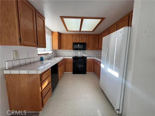 The U-shaped kitchen is designed for function with long tile counters, abundant upper and lower cabinetry, a window over the sink for natural light, and matching black appliances. True dual cooling—central A/C plus an evaporative system—keeps the home comfortable through every season, paired with ceiling fans throughout for efficient airflow.